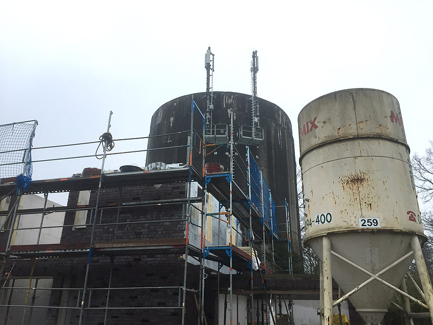 07.01.15: Es handelt sich bei der Installation um eine Telekom-Anlage. Das Baugerüst wurde mittlerweile abgebaut und die Anlage ist nunmehr in Funktion.