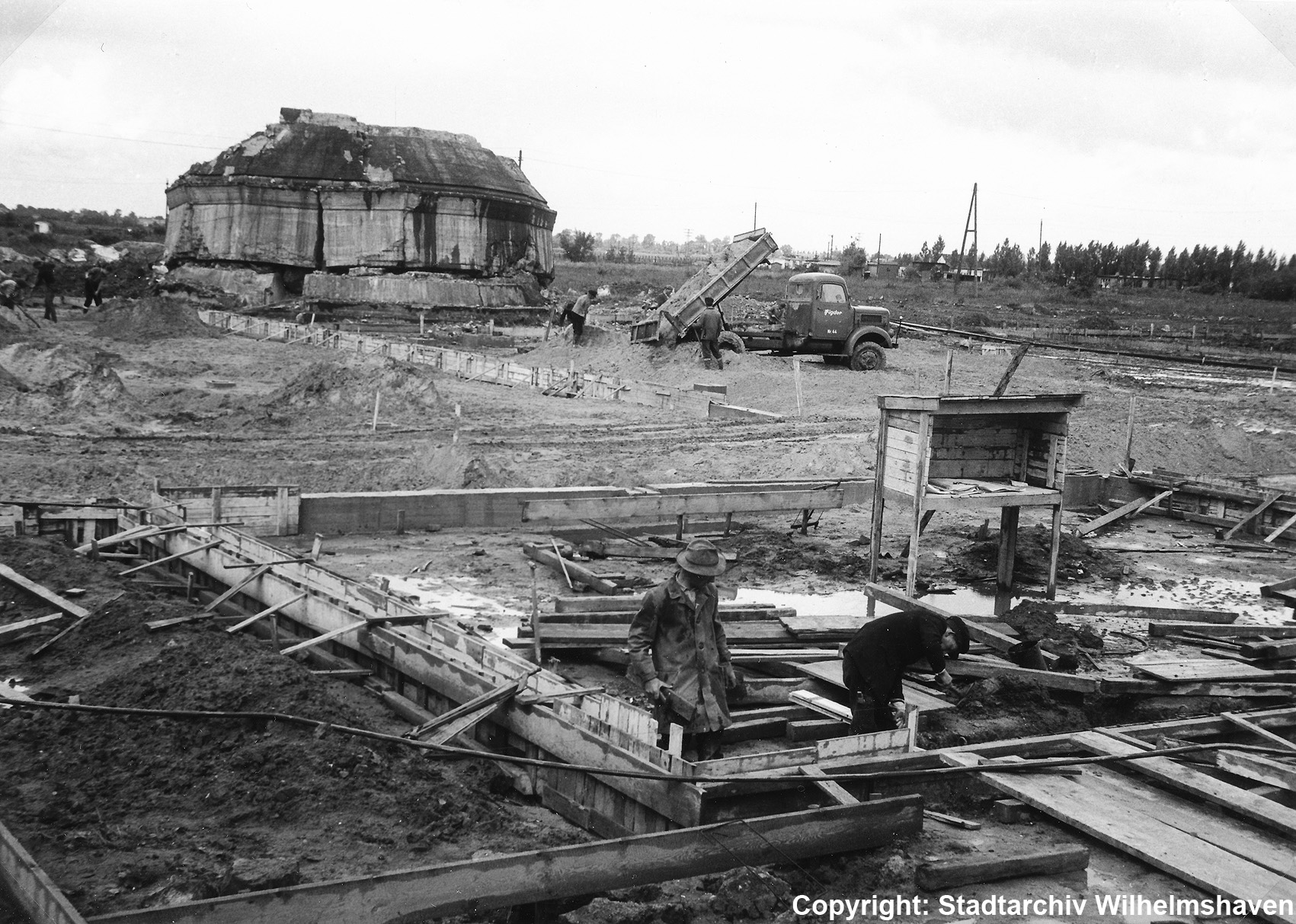 Unter dem Pfeil rechts die Kuppel des gesprengten Turmes. Die Reste der (Rund)Türme 3 und 4 waren hier bereits scheinbar großteilig entfernt (größerer Bildausschnitt nach links hin liegt vor). Dies dürfte damit zusammenhängen, dass diese spärlicher bewehrt waren und die Trümmer somit leichter beseitigt werden konnten. Auch die Sprengung selbst dürfte diese Türme in kleinere Trümmer zerborsten haben, als die anderen Exemplare im Banter Lager.