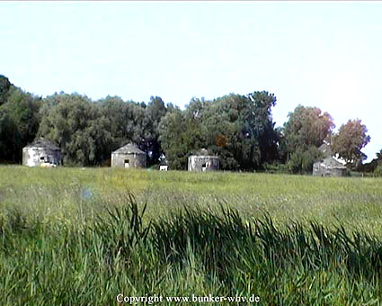 Der Fundamentbereich dieser vier Bunker ist klar ersichtlich, da sie mittlerweile teilweise schräg abgesackt sind, aber ohnehin im Fundamentbereich schon leicht erhöht über Erdgleiche angelegt worden waren.