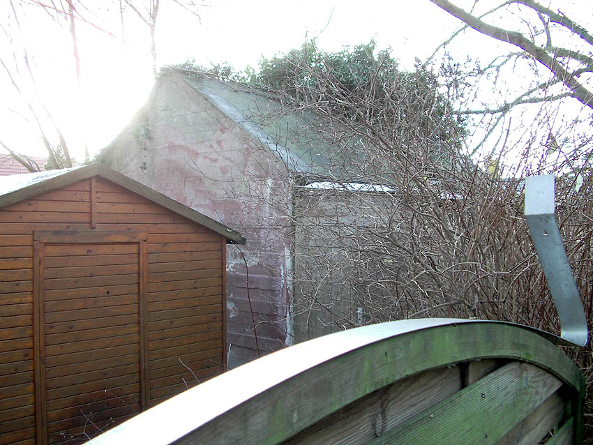 Der Kleinbunker besaß ein Spitzdach mit leicht abgeschrägtem Dachkantenbereich. Hier ergeben sich erstaunliche Ähnlichkeiten zum betonierten Deckungsgraben hinter der Klinkerstraße:
