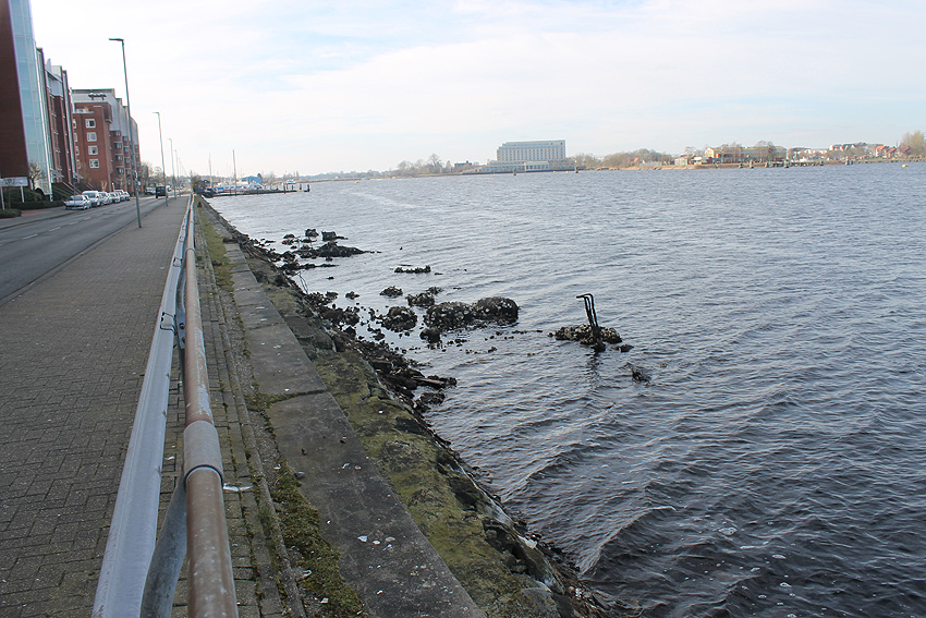 Trümmerstücke der alten Kaimauerbefestigungen / hier war das Westende der 1945 noch existenten Bereiche der Seydlitzbrücke. Eventuell auch einige durch Sprengung hierhin katapultierte Reste vom Bunker, direkt nördlich am Ufer des Hafens. Kurzzeitig im Sommer 2010 erkennbar, da der Hafenwasserstand um circa einen Meter abgesenkt wurde. Leichtsinniges Baden ist hier nicht zu empfehlen...