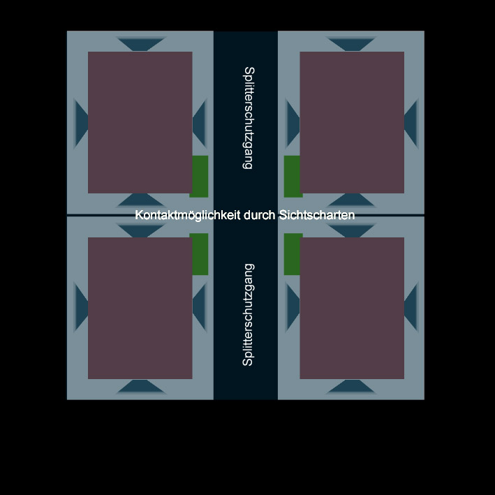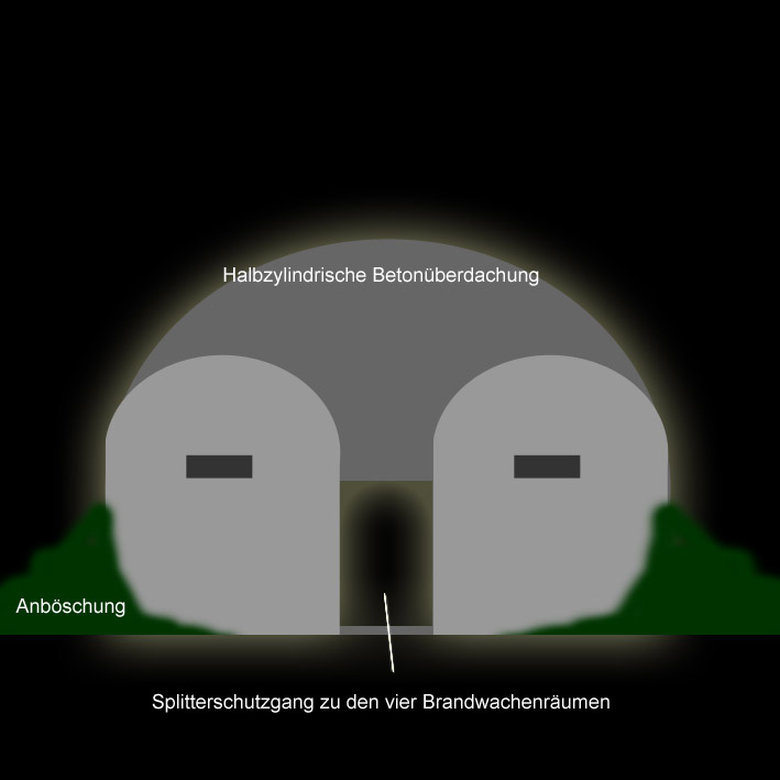 Es wäre theoretisch möglich, wenn auch sehr unwahrscheinlich, dass es sich bei dem Bunker um vier nebeneinander gestellte transportable Brandwachen / Splitterschutzunterstände wie zum Beispiel "Alaska" handelt, die mit einer massiven halbzylindrischen Stahlbetondecke übergossen und seitlich mit Erdreich angeböscht wurden.