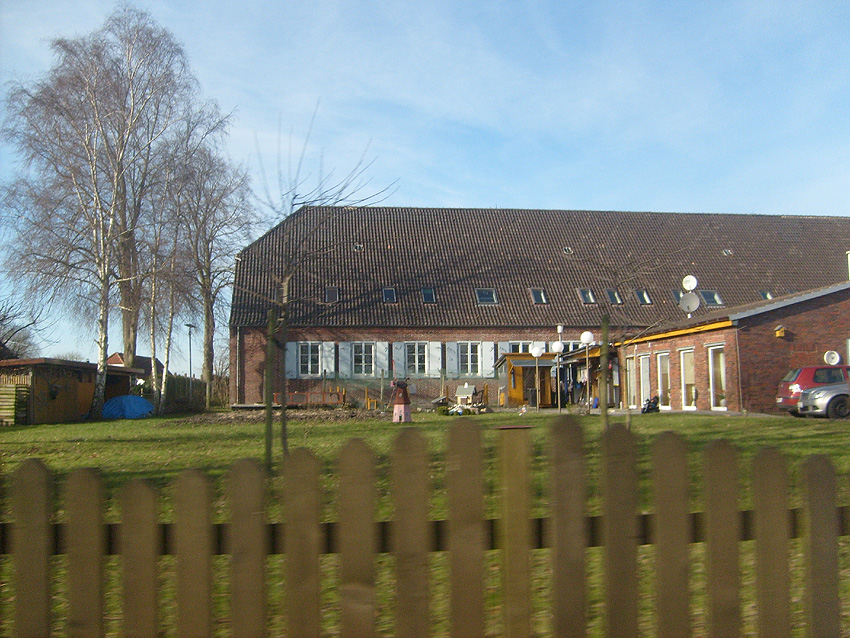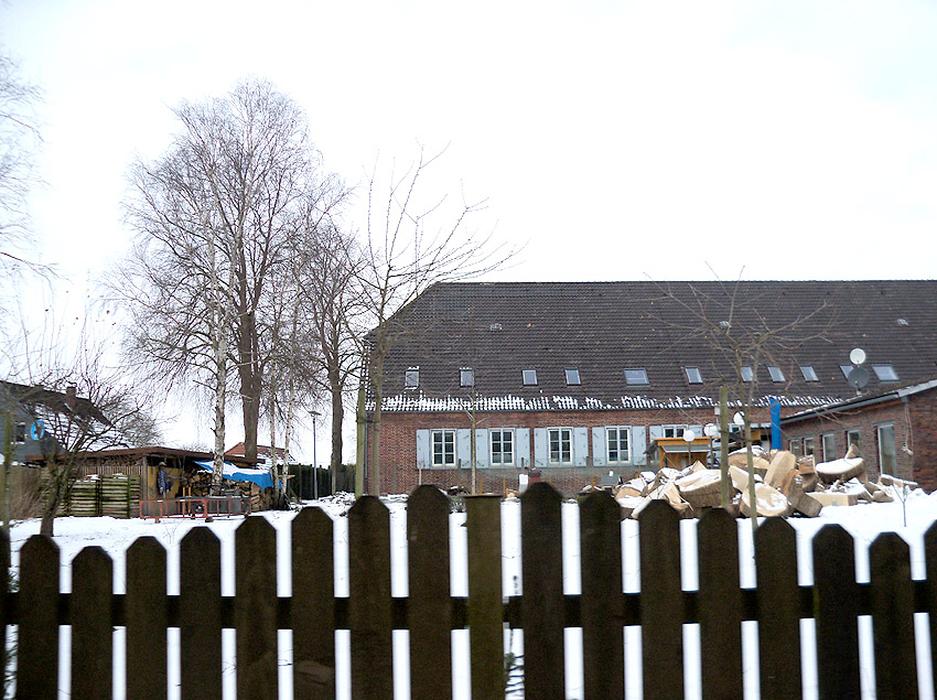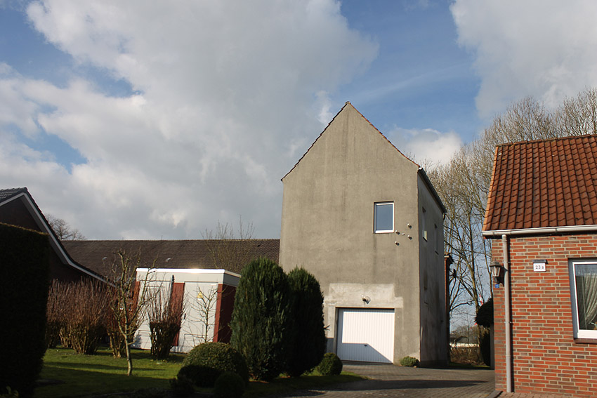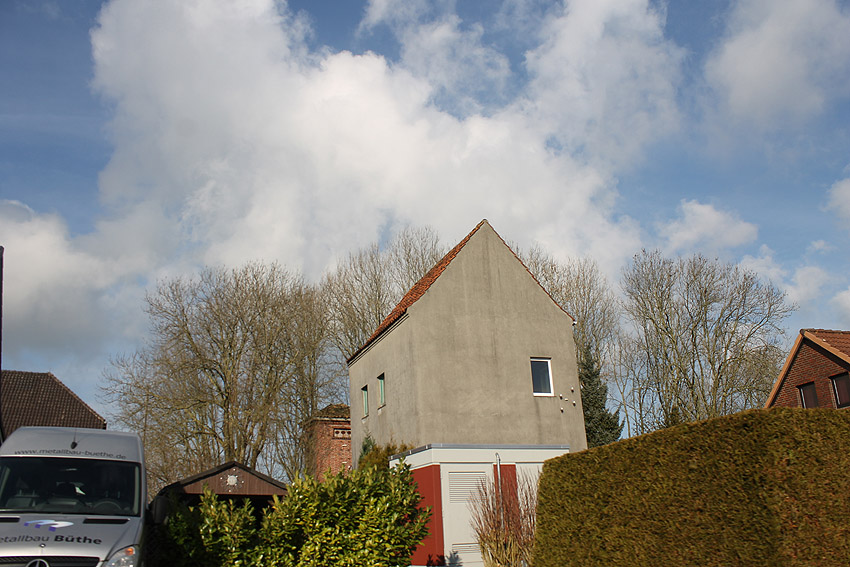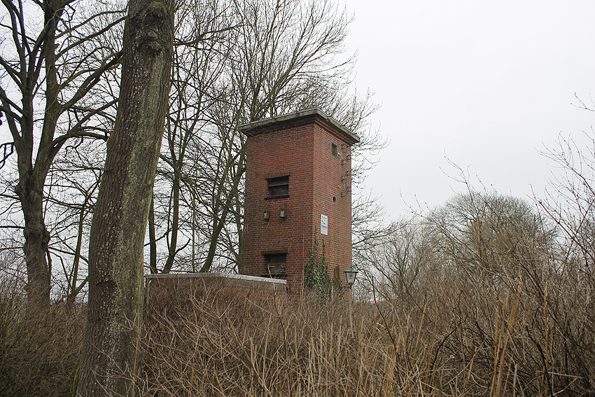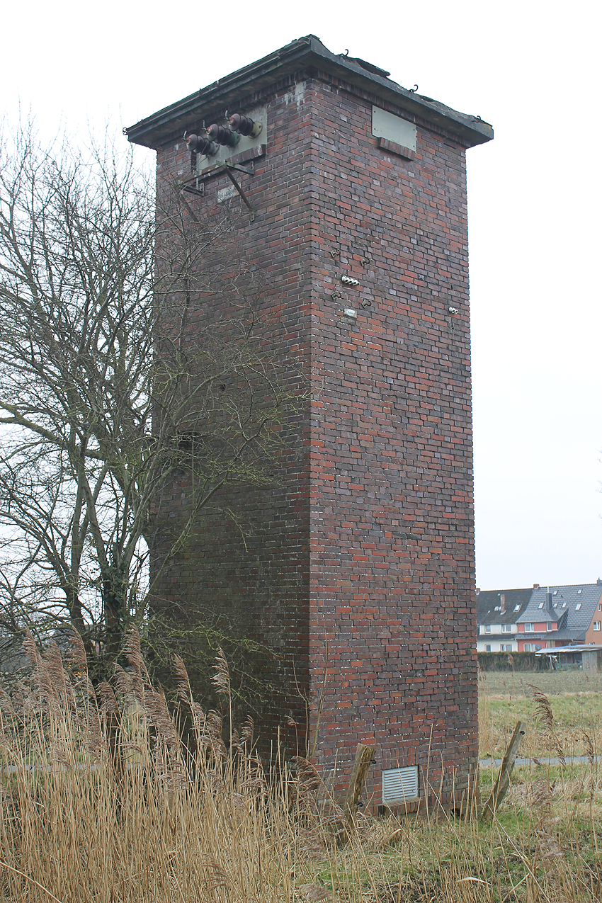 Trafoturm unweit des Gebäudes Antonslust. Ein weiterer Turm befindet sich etwas weiter westlich an der ehemaligen Marine-Nachrichtenstelle Langewerth und ein dritter Turm noch weiter westlich in Richtung Roffhausen. Von dort wird die Leitung nach Norden in Richtung Marine-Nachrichtenstelle Accum abgezweigt sein. Verbund zur schweren Flakstellung Schaar wird ebenfalls bestanden haben.