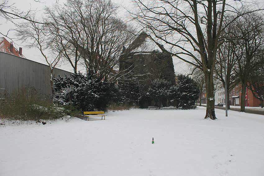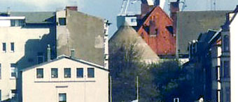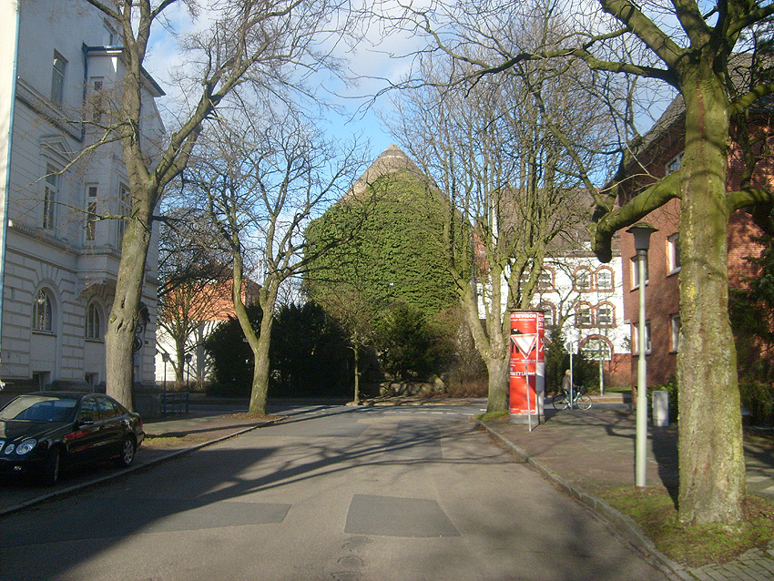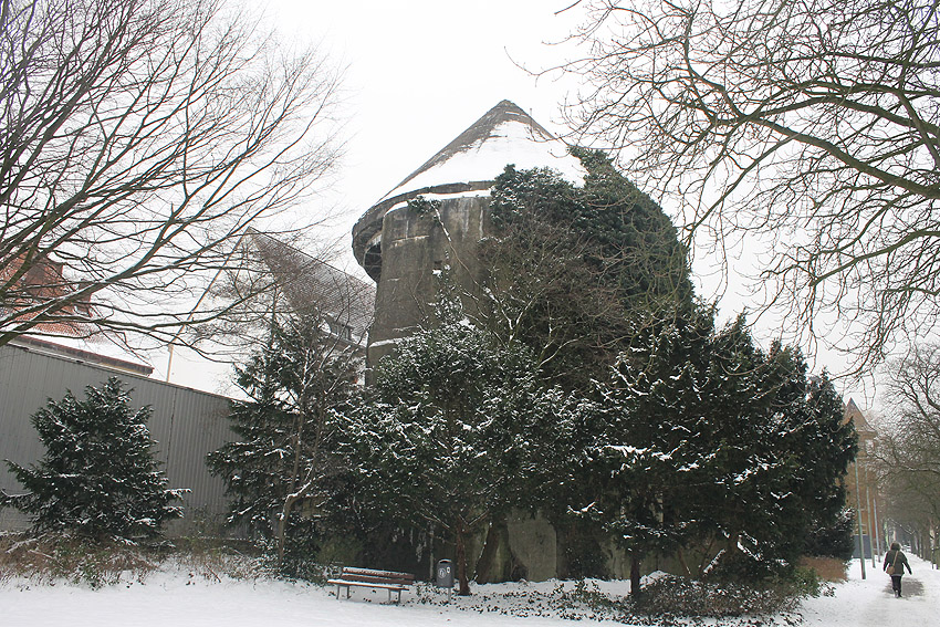 Vorne der Zombeckturm an der heutigen Rheinstraße, hinten der LS-Turm an der Ecke Rheinstraße / Gökerstraße mit schwarzer Tarnbemalung der Kuppel... Am Zombeckturm ist noch kein schwarzer Tarnanstrich der Dachkuppel vorhanden, er ist erst zur Kriegsmitte dort angebracht worden. Deshalb wird das Bild höchstwahrscheinlich bereits in frühen Kriegstagen aufgenommen worden sein.