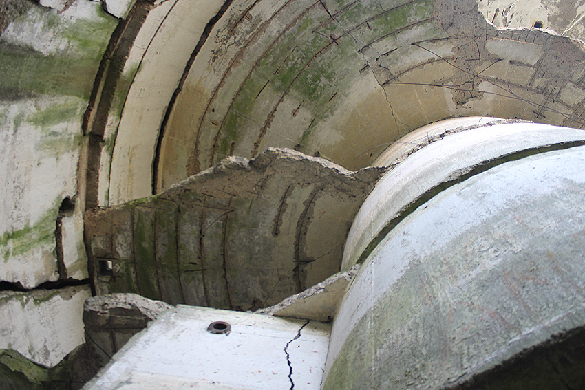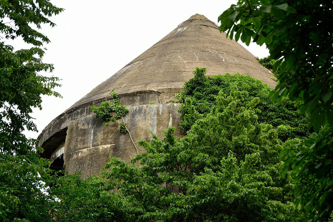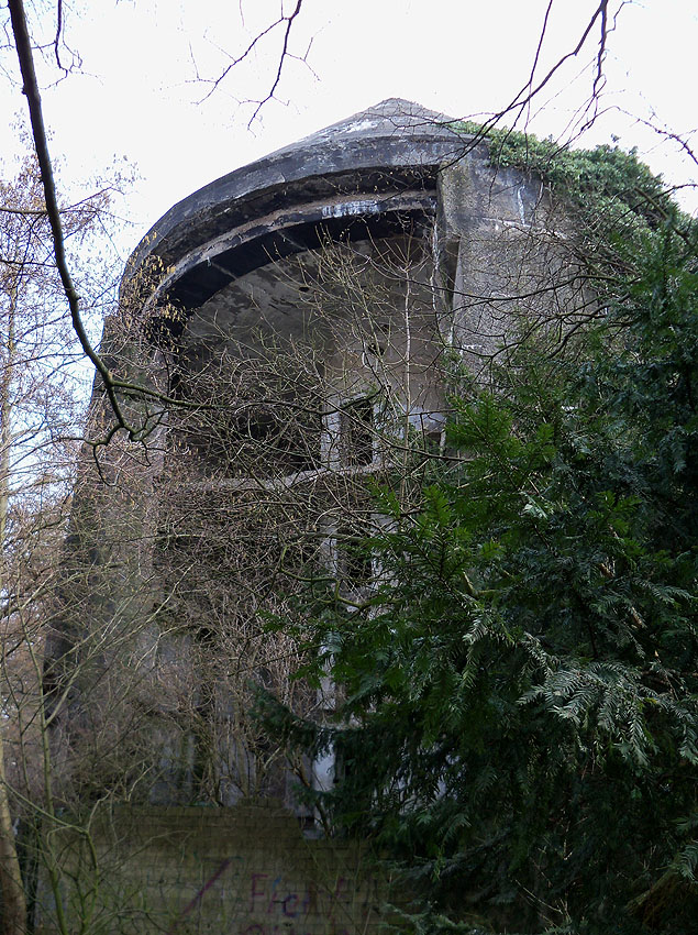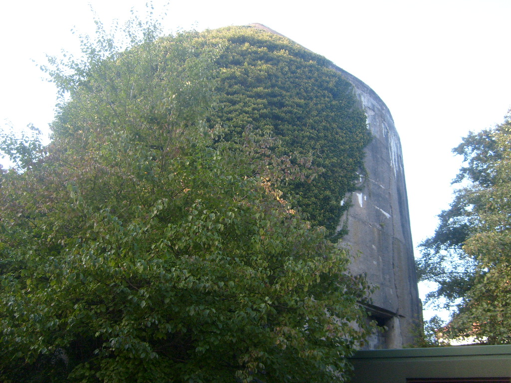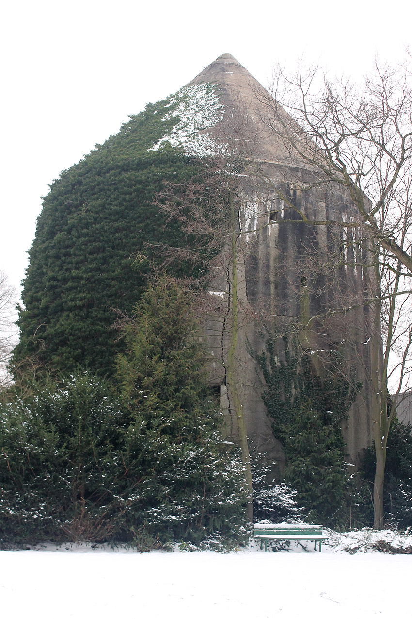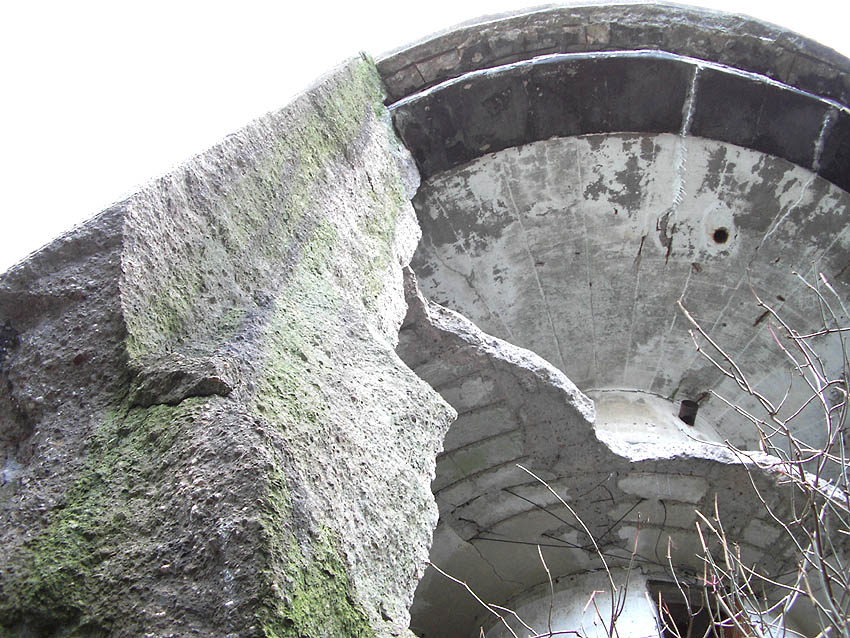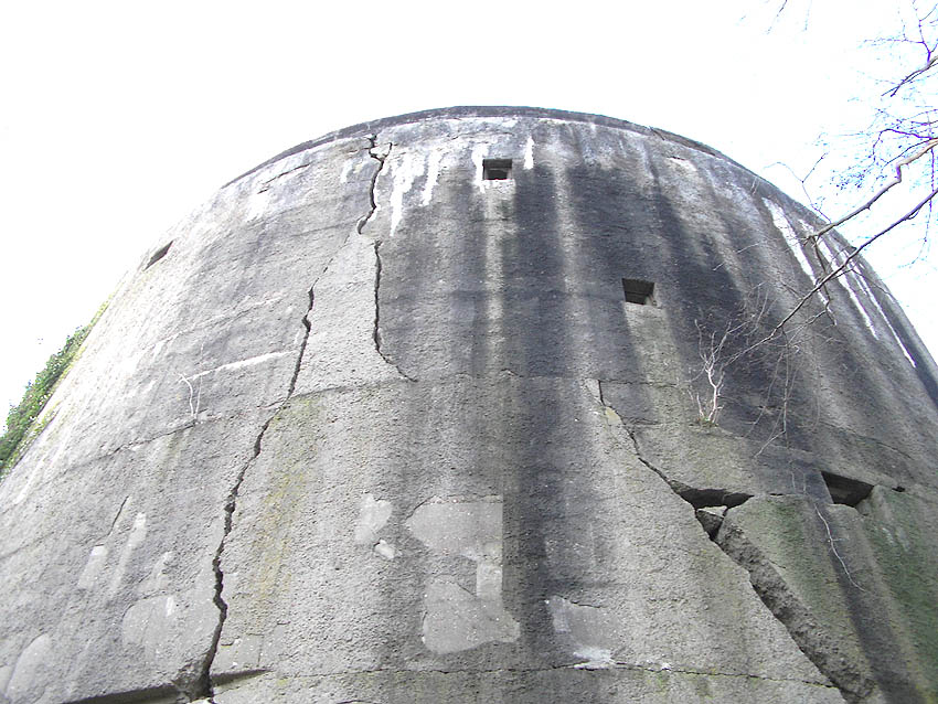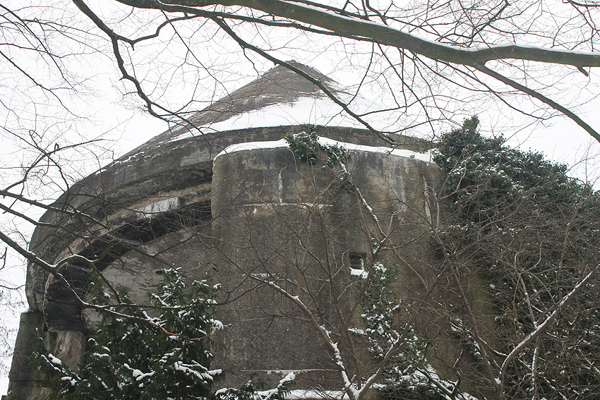 Hier sind noch Reste des schwarzen Tarnanstrichs der Dachkuppel zu sehen. Rechts neben dem Luftschutzturm ist der T 1500-Hochbunker "Trotz" teilweise zu erkennen.