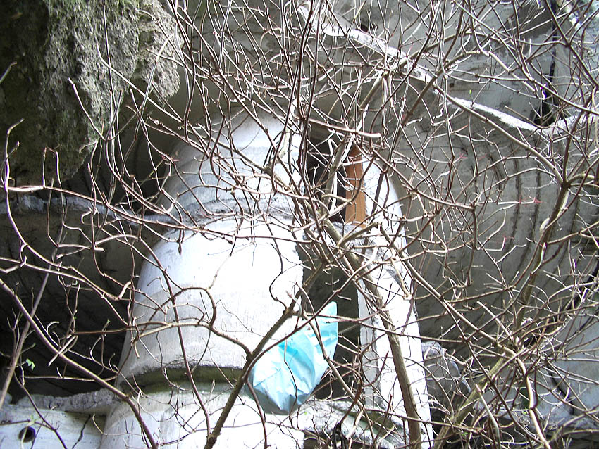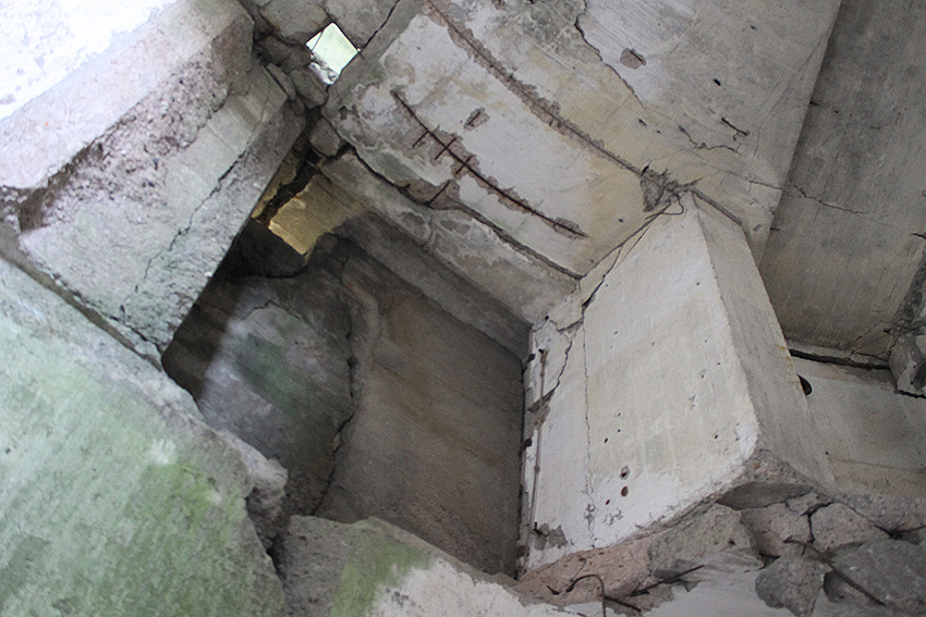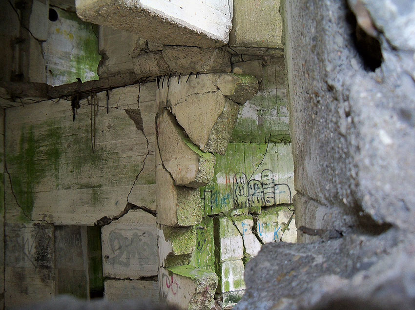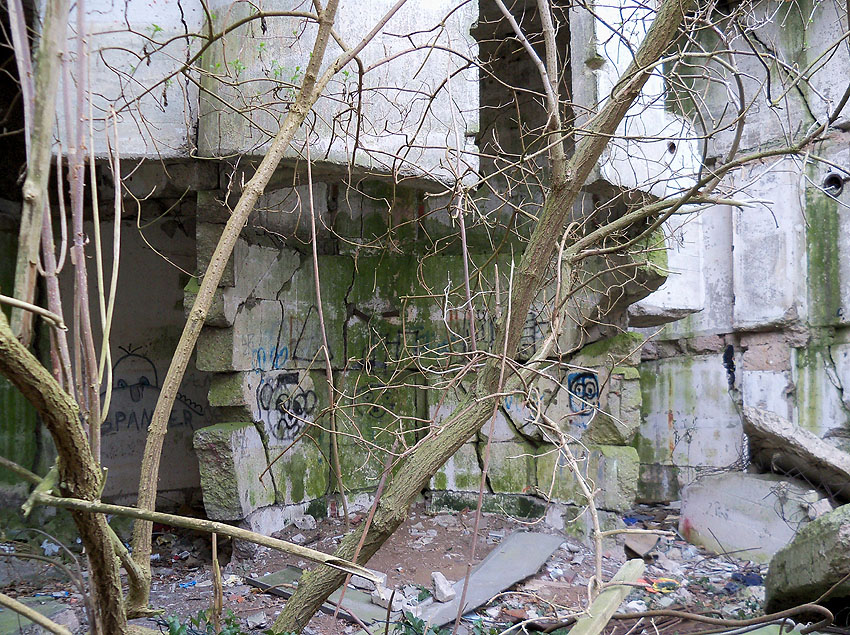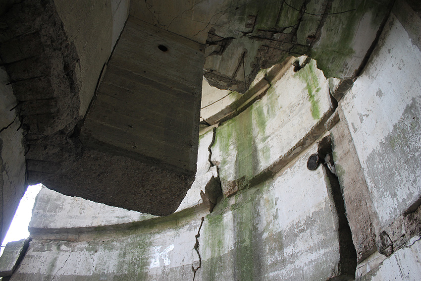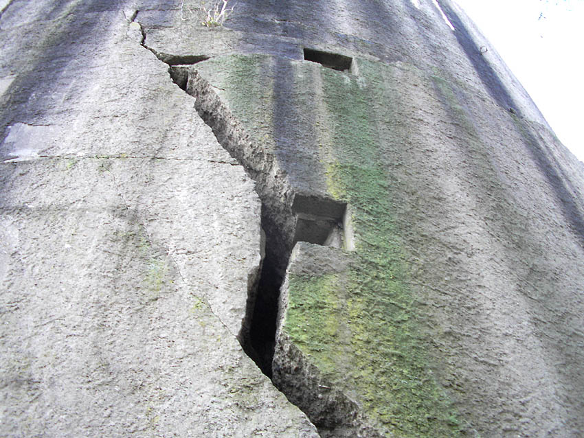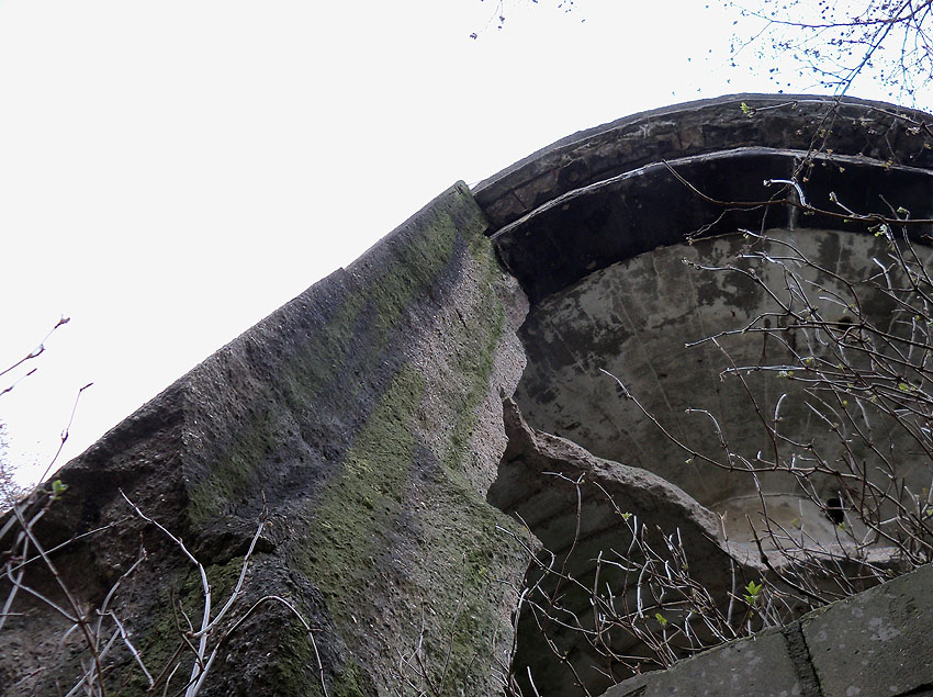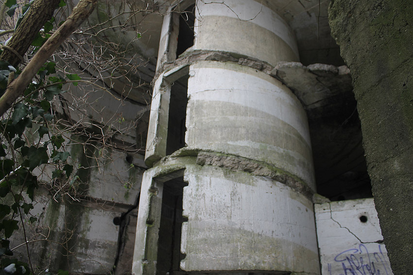 Nach der Sprengung. Der LS-Turm kippte nicht nach Norden zwischen die Kasernenbauten, wie von den Besatzern gewollt. Er blieb in diesem Zustand stehen, war aber augenscheinlich demilitarisiert und wurde der Stadt überlassen. Später wurden zwei Betonblöcke an die Bruchstellen des Sockelbereiches gegossen, um den Turm zu stabilisieren.