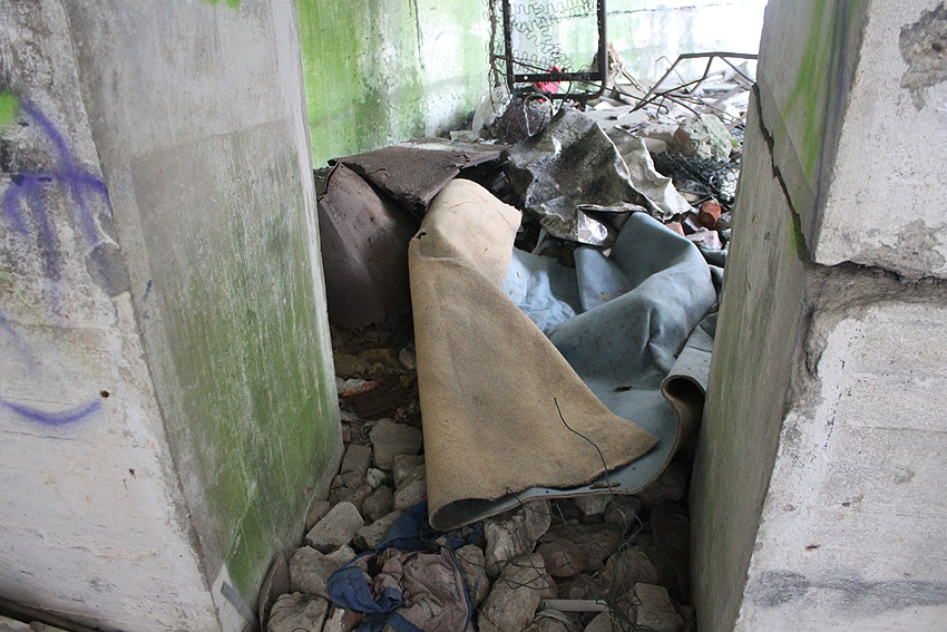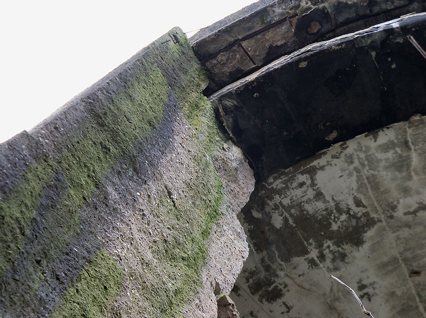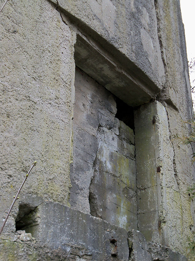 Betrachtet man das oben bereits abgebildete Foto aus den 1950er Jahren, so ist erkennbar, dass zumindest Teilbereiche der erhöhten Eingangstreppe / Rampe den Bombeneinschlag überstanden haben (links neben dem erhöhten Eingang). Die Plattform unter dem Eingang selbst wird vermutlich die nachträgliche Holzkonstruktion dargestellt haben, obwohl sie der Originalplatte aus Beton sehr ähnelt: