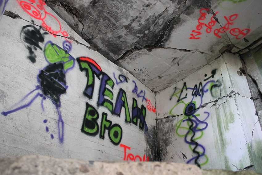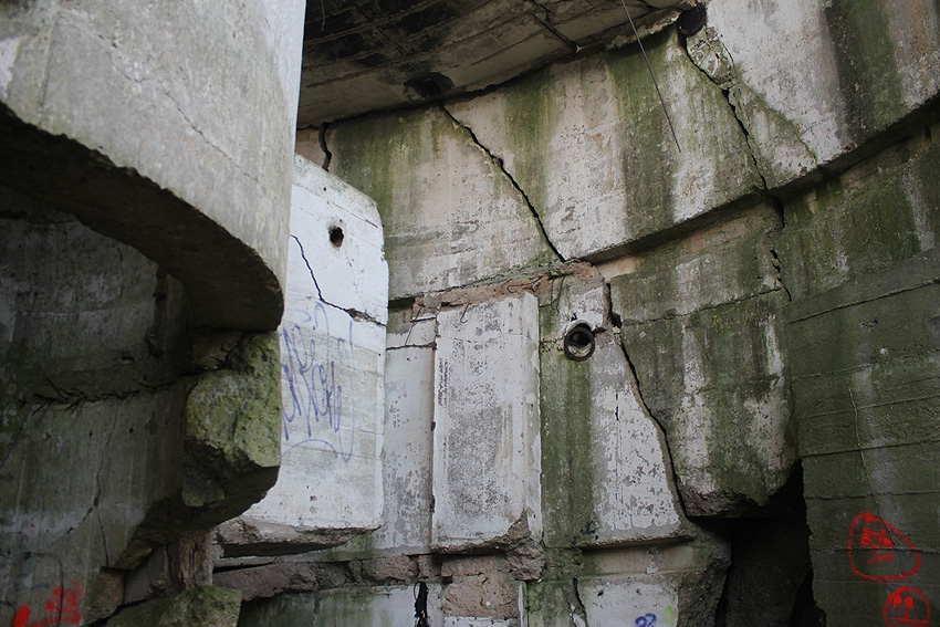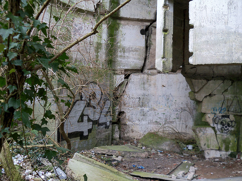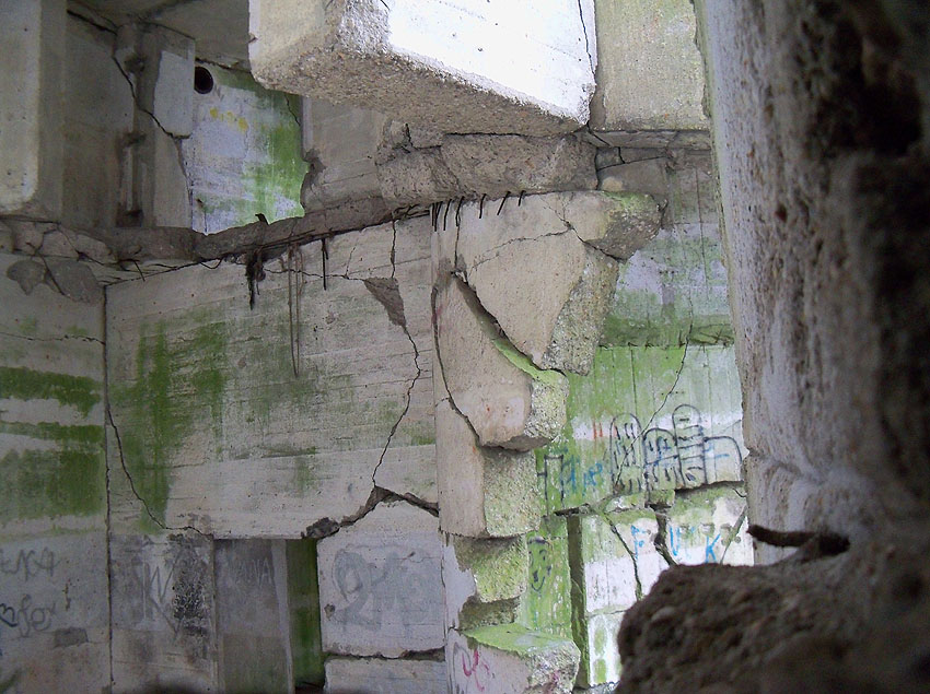 "Detonation einer Bombe nach Abgleiten vom Spitzdach direkt vor dem Bunkereingang (gemeint ist der zweite Eingang, beziehungsweise Notausgang - leicht erhöht - rechts des Haupteinganges) während eines Luftangriffes 1943 / 1944. Dadurch wurde die komplette Eingangstreppe weggesprengt (auch vor diesem Notausgang befand sich eine Treppe, siehe Bild oben) und die Schutzsuchenden im Bunker mussten nach der Entwarnung von Marineangehörigen der benachbarten Werft mit Leitern herausgeholt werden*. Danach wurde provisorisch eine Holzleiterkonstruktion angebracht."