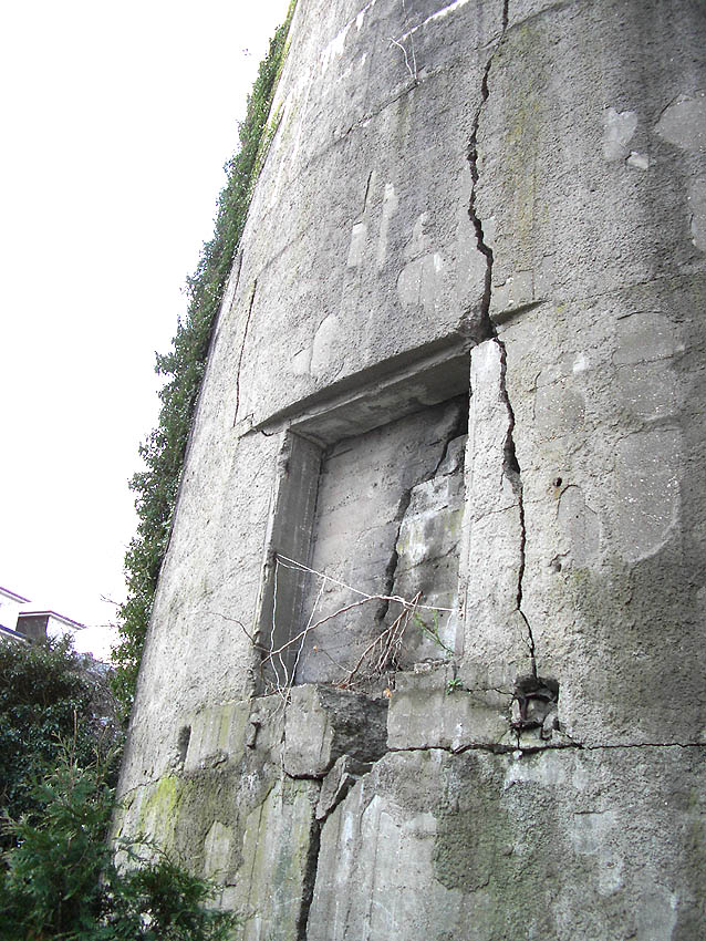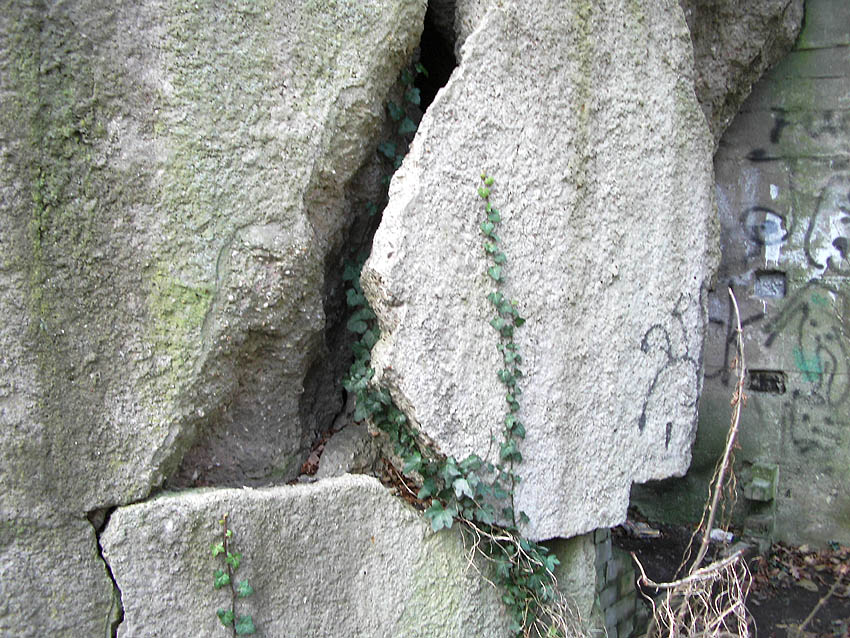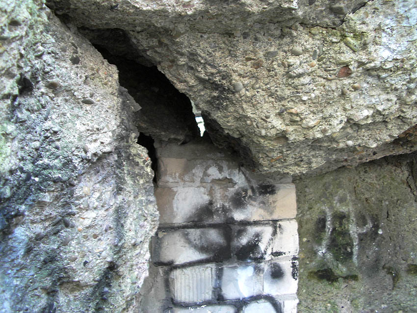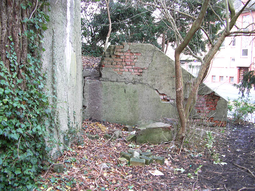 *Das hieße, dass der Haupteingang (Süd) an der heutigen Rheinstraße verschüttet war.(?) Oder war es die kleine Treppe dieses Einganges selbst, die in Mitleidenschaft gezogen worden war? Die heute noch vorhandenen Treppengeländer aus verputztem Mauerwerk sehen jedoch nach einem unversehrten Original aus.