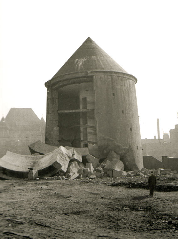 Dieses Bild wurde aus dem Dachbereich der anliegenden Bismarckkaserne / Moltkekaserne von Marineangehörigen aufgenommen. Es zeigt den intakten Luftschutzturm. Es ist das einzige bisher bekannte Bild, das auch einen kleinen Bereich der Seite des Turmes zeigt (ganz rechts), die später bei der Sprengung herausgebrochen ist.