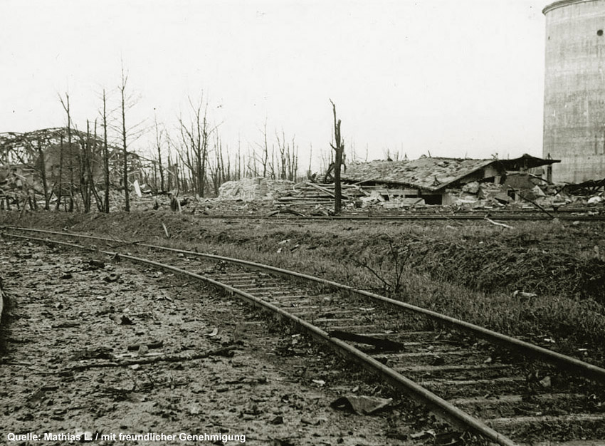 Seltene Aufnahme des LS-Turmes 2 (West) im Depot. Nach einem Luftangriff 1944 ist die umliegende Baustruktur großteilig zerstört. Blick aus Osten.