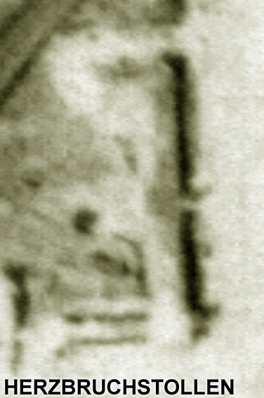 Der nordwestliche Bereich des Stollens, hinten links, schien bereits entfernt worden zu sein. Gut zu sehen aber zwei der drei Eingänge und leicht verdeckt hinten vorm Gebäude der dritte Zugang.
