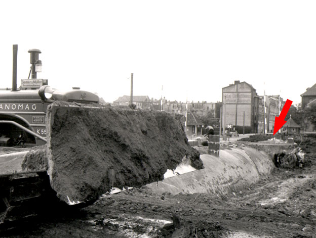 Zu erkennen ist hier der südliche runde Hauptbunkerkörper während der Abbrucharbeiten. Auch dieser Herzbruchstollen verfügte wie die Anlage am Pflegeheim Banter Weg sehr wahrscheinlich über zwei runde Hauptbunkerkörper. Diese waren hier jedoch im Gegensatz zur Anlage am Banter Weg mit einem Längsgang nach hinten, in westliche Richtung, versetzt.