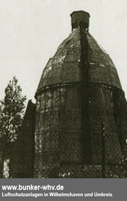 Eine Aufnahme aus frühen Kriegstagen, noch ohne später angebrachte Wandverstärkungen und ohne abgeschrägte Splitterschutzeingangsvorbauten wie auf den obig abgebildeten Aufnahmen. Interessanterweise ist der Turm zusammen mit dem bauartgleichen Bunker auf der ehemaligen Kriegsmarinewerft / Ostkaje (dieser ohne Verstärkungen) von der Grundform her ebenso sechzehneckig wie die bekannte 10er-16-Eck-LS-Turmserie Wilhelmshavens. Interessant ist der Ausstieg an der Bunkerwand in Ebene 5. Von hier aus konnte der auf den Turm gesetzte Beobachtungsstand mit integrierter Metallsplitterschutzzelle (andere Quellen bezeichnen ihn auch als Scheinwerferstand) über eine Steigleiter betreten werden. Im Zuge der späteren Verstärkung des Turmes wurde die Öffnung verschlossen und die Steigleiter hatte ihren Beginn am verbreiterten Turmsockel. Der hier abgebildete Turm wurde nach dem Krieg ansatzweise entfestigt (auf einigen der oberen Bilder zu erkennen) und 1975 abgebrochen.
