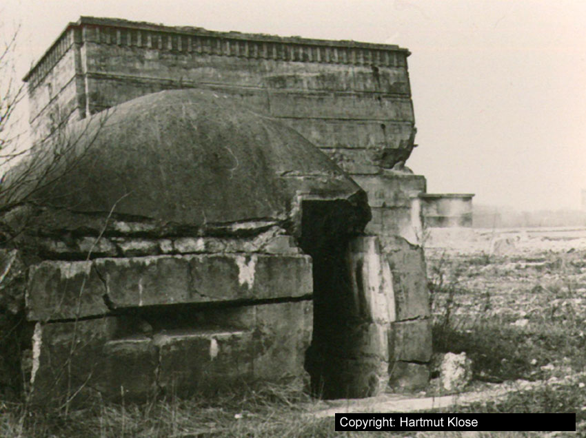 Aufnahmen des gesprengten Artilleriebunkers. Im Vordergrund ist auf dem obersten Bild ein gesprengter Kleinbunker erkennbar. Dieser wurde bald nach der Aufnahme des Fotos entfernt. Im untersten Bild ist der Bunker in den 1960er Jahren während des endgültigen Abrisses erkennbar. Aufnahmen aus den 1950er Jahren, 1958 und aus den 1960er Jahren.