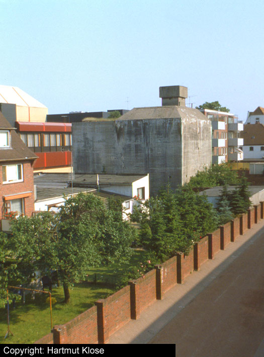 Aufnahmen des Hochbunkers Störtebekerstraße / Rathaus im zum Wohnhaus umgebauten Zustand. Heute ist das Bauwerk unter anderem Treff des Bauvereines Rüstringen ("Treff auf Siebethsburg" / "Hier auf Siebethsburg"). Aufnahmen aus dem Jahre 1981.