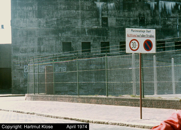 Aufnahmen aus dem gesprengten Artilleriebunker hinaus auf das ehemalige Bauwerftgelände. Im Hintergrund zu erkennen der ebenfalls gesprengte Befehlsbunker. Beide Bunker wurden entfernt. Heute ist dies der Standort des Marinearsenals. Aufnahmen aus den Jahren 1957 und 1958.