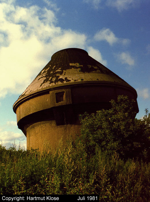 Die links ersichtliche Schutzzelle ist eine Metallsplitterschutzzelle der Bauart "Mannesmann". Diese Zelle war mit ziemlicher Sicherheit ursprünglich oben auf der Kuppel eingebettet in den Beobachtungsstand des LS-Turmes (siehe Aufnahmen des intakten Turmes).