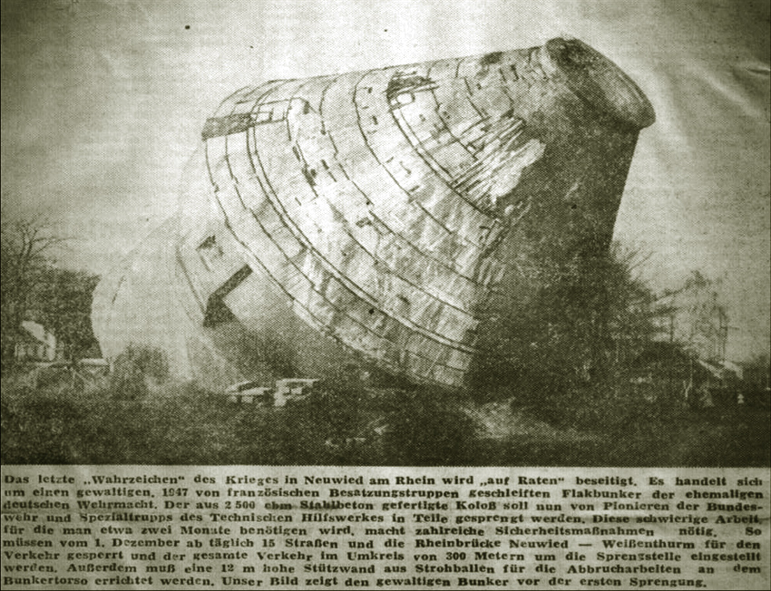 Eventueller Eigenname unbekannt: Dieser Dietel-Turm wurde im Gebiet der Zementwerke Neuwied errichtet. Er stand links, einige hundert Meter (von "Engers" kommend) vor der Brückenauffahrt zur damaligen Hermann-Göring-Brücke. Dieser Turm schien nicht ganz so hoch wie vorgesehen ausgeführt worden zu sein. Unser Leser Helmut schreibt dazu: "Da man ihn nicht (ein zweites Mal...) sprengen konnte oder wollte, sollte er dann durch Untergrabung langsam versenkt, beerdigt werden. Er wurde praktisch von allen Seiten her untergraben. So hab ich's in Erinnerung." Der heutige Status des Turmes ist uns unbekannt. Es könnte aber sein, dass Reste des Turmes oder vielleicht sogar Großteile vom Bauwerk unter Erdgleiche im liegenden Zustand (der Turm ist nach einer ersten Sprengung durch die französischen Besatzer bereits umgekippt) noch heute vorhanden sind. Dies ist jedoch unwahrscheinlich (siehe auch Artikel oben). Mutmaßlich hat es sich bei diesem Turm garnicht um einen Dietel-Turm gehandelt, sondern (dann ähnlich wie es beim Rüsselsheimer Exemplar vage vermutet wird) um einen äußerst seltenen LS-Turm der Bauart Zombeck mit Plattform. Hinweise darauf lassen sich bis dato jedoch nicht weiter nachverfolgen.