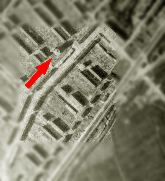 Hier ersichtlich am oberen Pfeil der Standort des zuvor beschriebenen Objektes im Jahr 1945. Befand sich eventuell einige Meter südlich im heutigen Kleingartengelände eine weitere Luftschutzanlage?