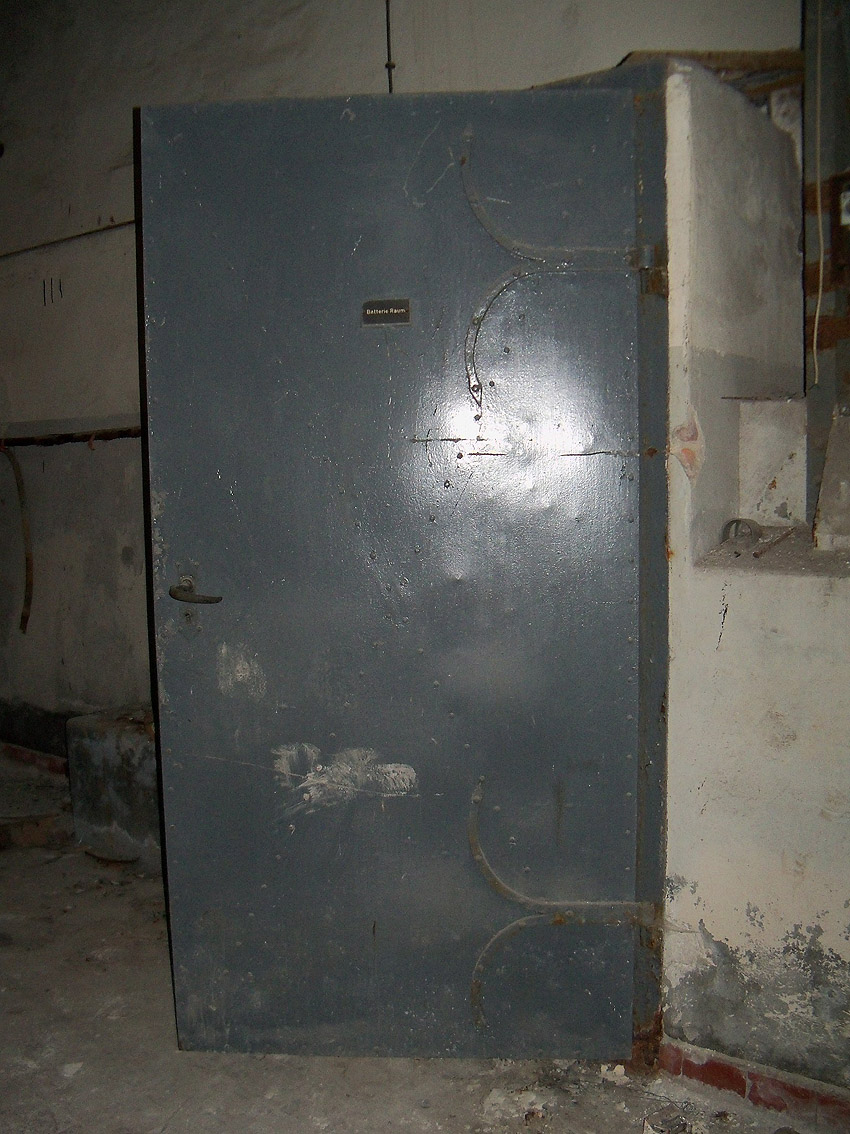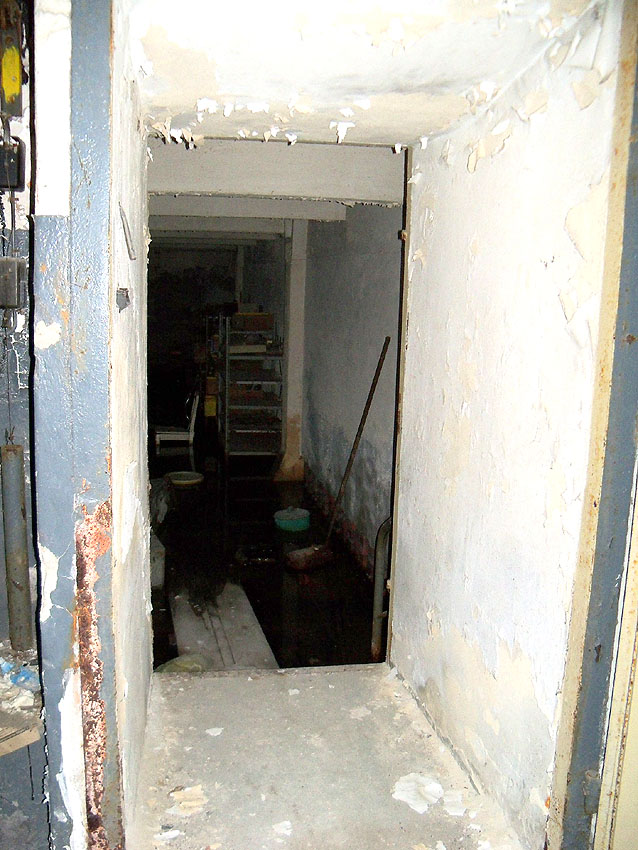 Blick durch die oben erkennbare rückwärtige Tür in den dortigen nach links verlaufenden Vorkeller und den ehemaligen LS-Raum selbst. Dort im Hintergrund links ist wiederum der oben abgebildete Hauptzugang erkennbar: