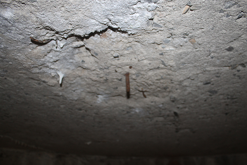 Nachtrag 26.04.15: Es handelt sich hierbei nachweisbar um die Reste der ehemaligen Mittelsäule. Diese wurde wohl vor Jahren aus "Vandalismusgründen" zerstört. Siehe aktuelle Fotos weiter unten / an der Decke ist die ehemalige Aufnahmestelle der Säule noch zu sehen...