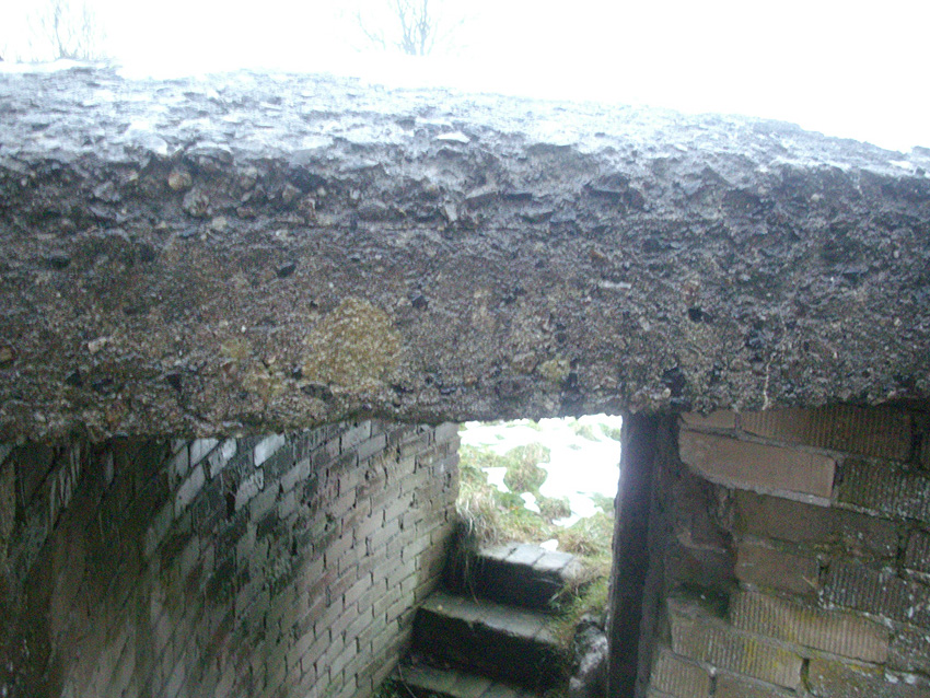 Die Decke besteht aus Stahlbeton. Auf dem oberen Bild zeigen die abgeplatzten Stellen der Wandbereiche eindeutig, dass hinter dem Mauerwerk eine Betonwand liegt, wie auch im Inneren des Baues zu erkennen ist. Die Konstruktionsweise ist bei diesem Objekt besonders gut zu ersehen. Es kann davon ausgegangen werden, dass auch die anderen Rundschutzbauten dieser Art im Bereich Ardorf wie auch im Friedeburger Gebiet derartig aufgebaut sind.