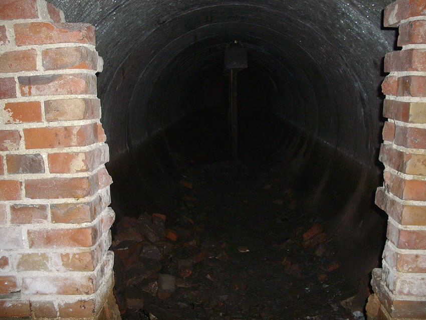 Der Deckungsgraben (im Hintergrund ein circa 50 Meter hoher Ziegelei-Schornstein, kein Lüftungsrohr des Grabens!). Die Ähnlichkeit des Fotos zum Herzbruchstollen Pflegeheim Banter Weg in Wilhelmshaven ist verblüffend: