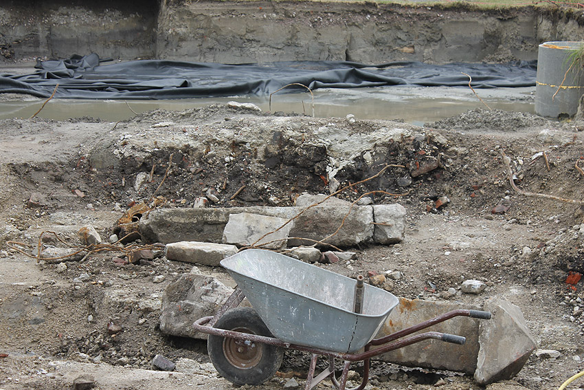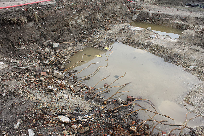 Die Betonstrukturen im Baustellenbereich sind größtenteils beseitigt worden. Weitere Strukturen als die ersichtlichen sind nicht mehr ans Tageslicht getreten. Nun erfolgt die Tiefgründung des Neubaues.