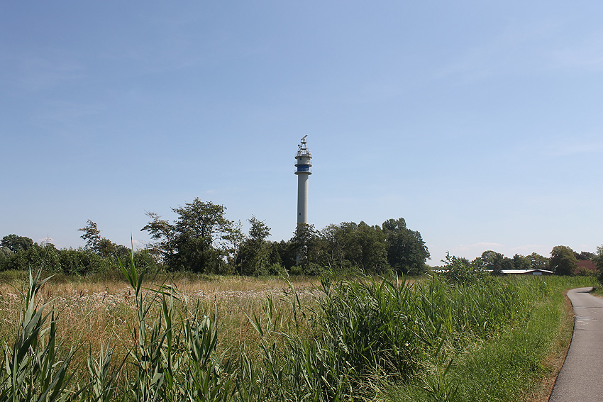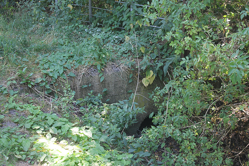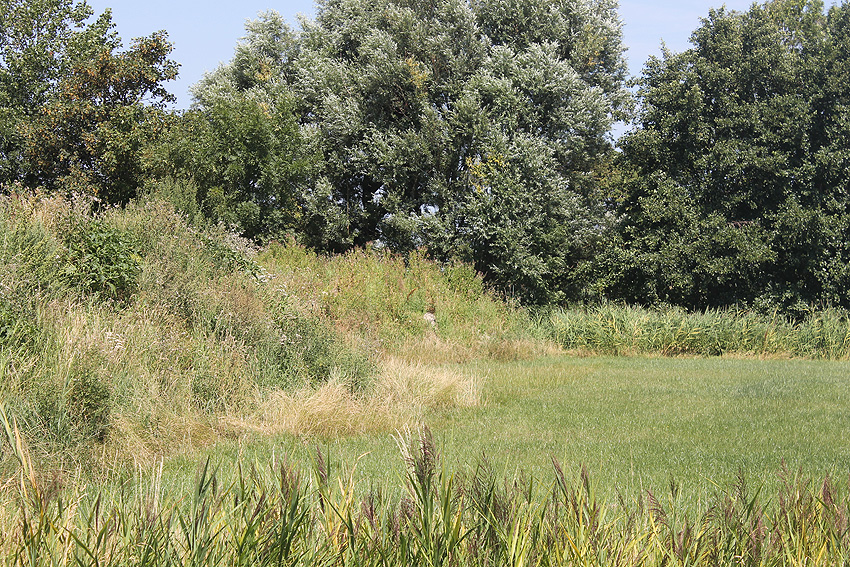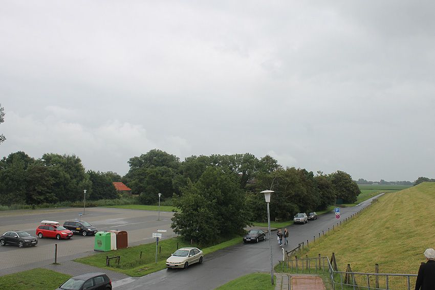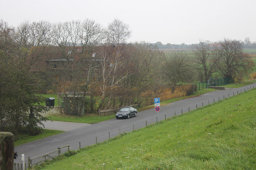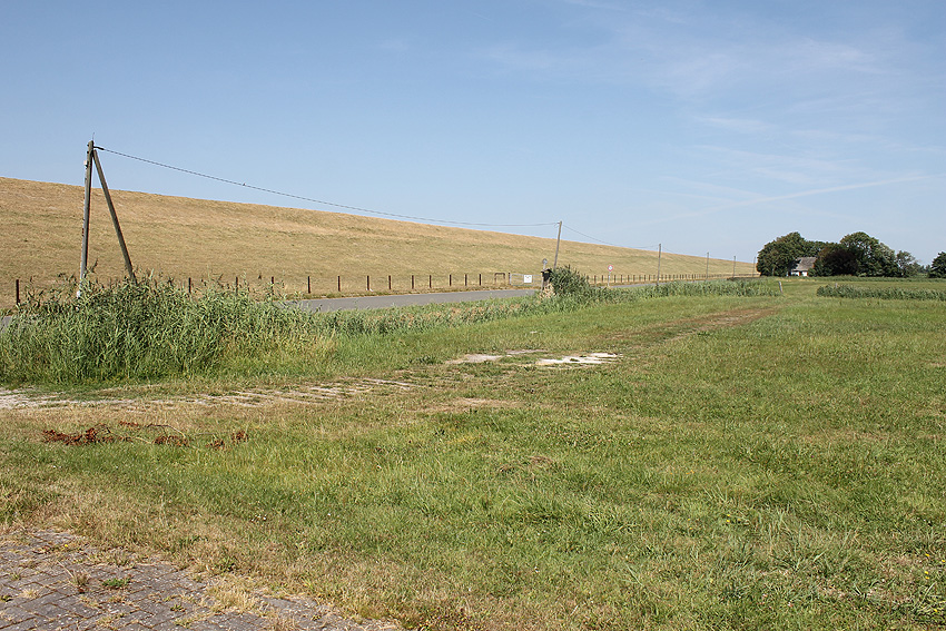 Oben: Hier auf dem Deich befand sich Scheinwerferstand 17 / Peters-Denkmal.