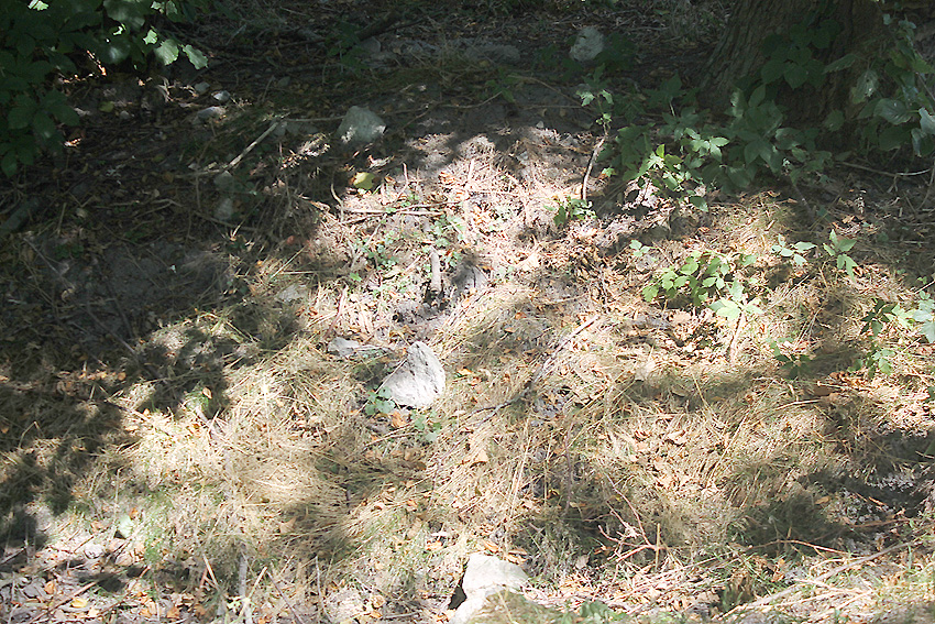 Oben: Genau zwischen den beiden Laternen auf dem heutigen Parkplatz stand der etwa 18 Meter hohe massive Leitturm des Untergruppenkommandos Ost. Dieser wurde nach dem Krieg gesprengt und später zumindest über Erdgleiche komplett abgetragen. Das erkennbare Gebäude mit dem roten Dach ist ein Unterstell-Garagenbau aus Kriegszeiten.