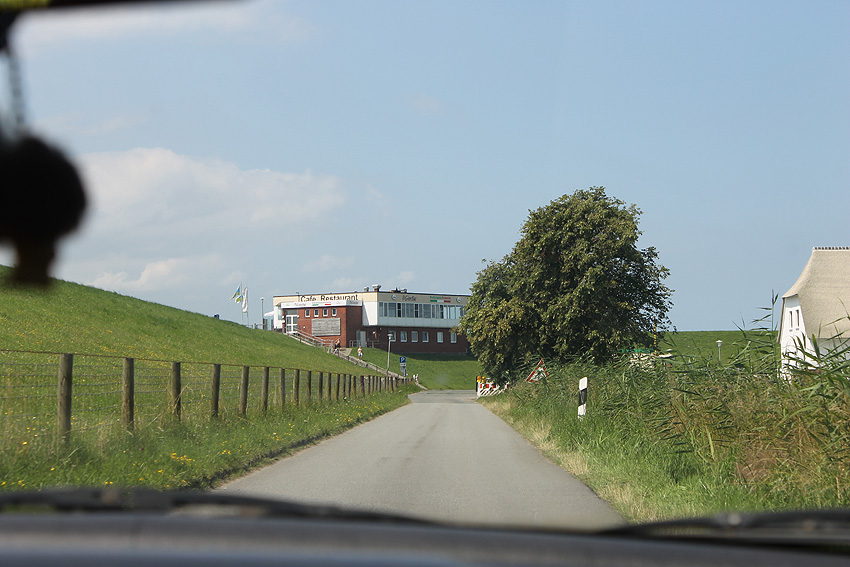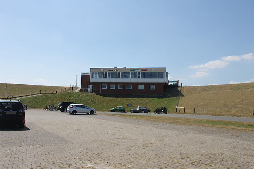 Oben: Rechts Süd-Teilbereich des ehemaligen Wirtschaftsgebäudes / inzwischen saniert und renoviert / das Restaurant auf dem Deich im Bereich Peters-Denkmal hat keinen historischen Zusammenhang mit der Flakstellung bzw. mit dem anliegenden Untergruppenkommando Ost.