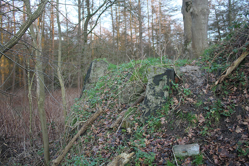 Decke und Wände großteilig zerstört / Trümmer großteilig beseitigt / augenscheinlich nur Eingangswände links und rechts teilweise erhalten / augenscheinlich Rest zumindest eines Lüftungsschornsteines erhalten / Erdum- überböschung in Ansätzen erhalten