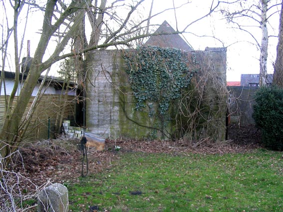 Zu erkennen ist, dass augenscheinlich der nordwestliche Teil des Bunkers bis unter / in den Garagenanbau hineinreicht. Der äußerst massive Kleinbunker ist also nicht quadratisch aufgebaut, sondern rechteckig. Obwohl die Garagen recht alt aussehen, dürften sie erst nach dem Krieg erbaut worden sein. Auf vorliegenden Luftbildern aus Kriegszeiten ist die damalige Situation leider nur schwer erkennbar. Da der Bunker als bombensicher gelten kann, müsste er theoretisch (wenn er offiziell als bombensicher eingestuft war) auch einen zweiten Zugang besitzen. Dieser dürfte sich dann entweder an der Seite, an der die Garagen liegen (Nordwestwand / Nordbereich Nordostwand) befinden, oder an der nicht einsehbaren Rückwand (Süd-West).