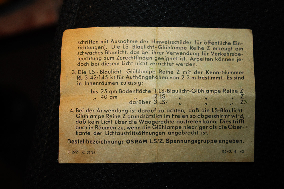 Bei Verdunklung wurden im Zweiten Weltkrieg reichsweit LS-Glühlampen benutzt, um eine Notbeleuchtung zu gewährleisten. Diejenige der Firma OSRAM war am bekanntesten und wurde mit der RL-Nummer 3-42/145 (Blaulicht) eingetragen. Dies hieß, dass das Produkt für Luftschutzzwecke offiziell genehmigt worden war.