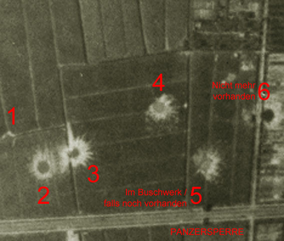 Von sechs Einschlägen im Nahgebiet sind noch mindestens vier bis dato auf der dortigen Weide vorhanden (Stand Januar 2018). Die mit Wasser vollgelaufenen Einschlagstrichter, inzwischen Biotope, werden von Angriffen Ende 1944 / Anfang 1945 stammen, da sie sonst in früherer Zeit sehr wahrscheinlich wieder zugeschüttet worden wären, um die Moral der Bevölkerung aufrecht zu erhalten. Bei den Bombenwürfen könnte es sich eventuell um Fehlabwürfe auf freier Fläche gehandelt haben. Die Entfernung dieser Trichter dürfte mittelfristig im Rahmen des Neubaugebietes erfolgen. Eventuell hätte man hier ein mahnendes Bodendenkmal zumindest aus zweien der Trichter machen können. Ein Bodendenkmal gibt es hier bereits: Die Potenburg-Fundamentreste. Vielen Dank an Herrn Titsch für die interessante Führung. Hier