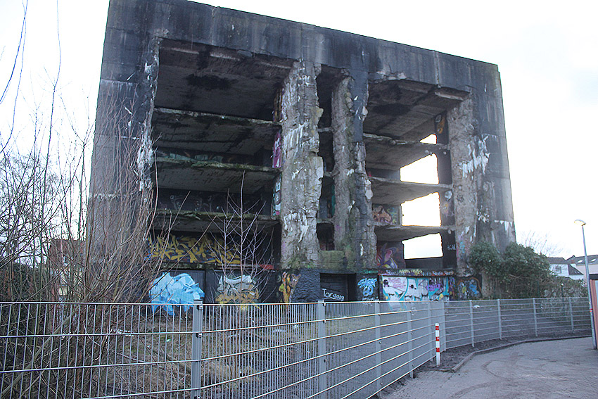 Der gerippeartige "Hochbunker", den ich damals sah, befand sich unweit einer Fischbratküche, in der wir seinerzeit in den frühen 1980er Jahren zu Gast waren. Auch eine Kirche stand in der Nähe...