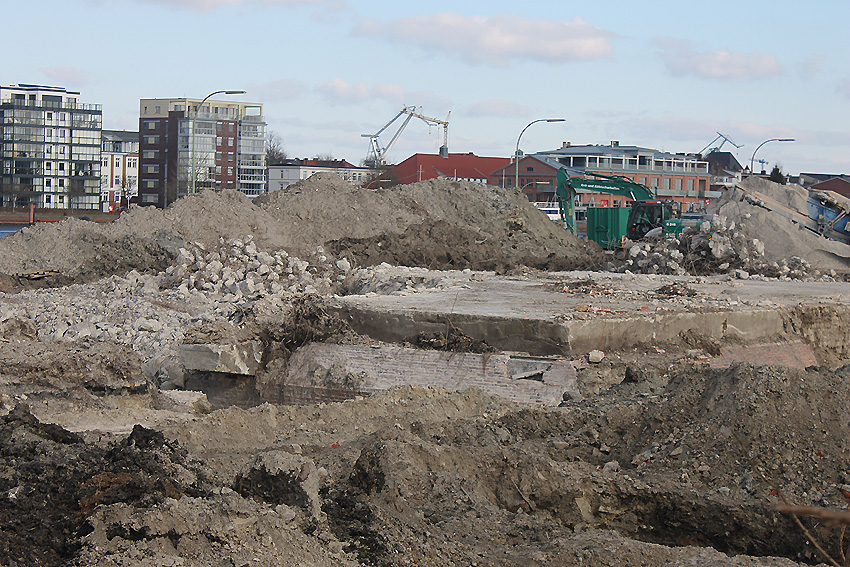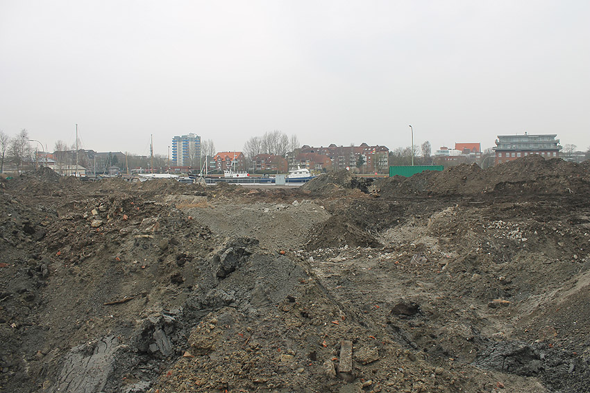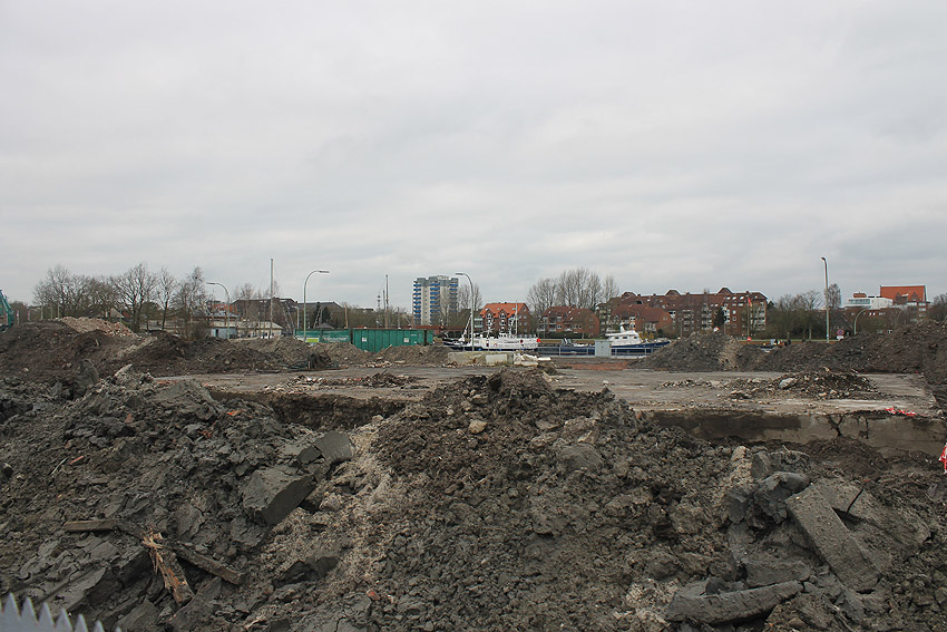 Vor einiger Zeit wurde im Marinearsenal das Gelände westlich der Jachmannbrücke im südlichen Bereich komplett gerodet. Hier soll mittelfristig ein neues Trockendock entstehen. Zum Vorschein kamen diverse Trümmerrelikte aus Zeiten bis 1945. Diese Relikte wurden nach der Demilitarisierung ab Ende der 1940er Jahre nicht geräumt, blieben demzufolge liegen und wuchsen später zu. Das momentane Bild sieht nun aus, wie fast die gesamten Flächen unmittelbar nach der Zerstörung und großteiligen Räumung der Werft Ende der 1940er bis Anfang der 1950er Jahre. Hier