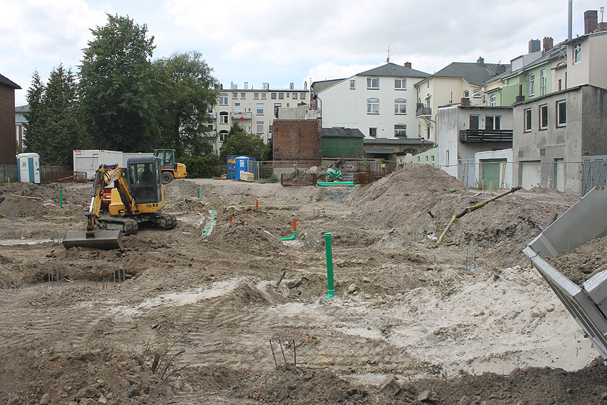 Rundbunkerfundament ehemalige Schule Allerstraße: Wider Erwarten dürfte die Bunkerplatte glücklicherweise doch erhalten bleiben. Sie wurde lediglich im Südostbereich zusätzlich zu den damaligen Abbruchbereichen noch ein kleines Stück abgefräst. Der Neubau wird dort dann direkt an die Platte grenzen. Wir berichten weiter. Hier