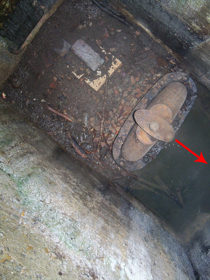 Historische Stahlklappe westlich am Fort Schaar: Das Innere zeigt einen Schacht mit einer Art Schieber am Boden. Vom Fortgraben her ist ein Zufluß vorhanden, dieser ist mit Gestein, usw. verstopft. Wahrscheinlich nachträglich verstopft, um eine Verringerung des Wasserstandes des alten Fortgrabens bei Niedrigwasser der Maade / bei Schieberöffnung zu verhindern. Zur nahen Maade hin befindet sich ein Kanalrohr, im Bild am Pfeil ansatzweise zu erkennen. Hier sollte wohl der Wasserstand vom Fortgraben im Zusammenspiel mit der Maade reguliert werden. Was die Betonquader im Umfeld für einen Zweck hatten, ist allerdings weiterhin ungeklärt. Hier