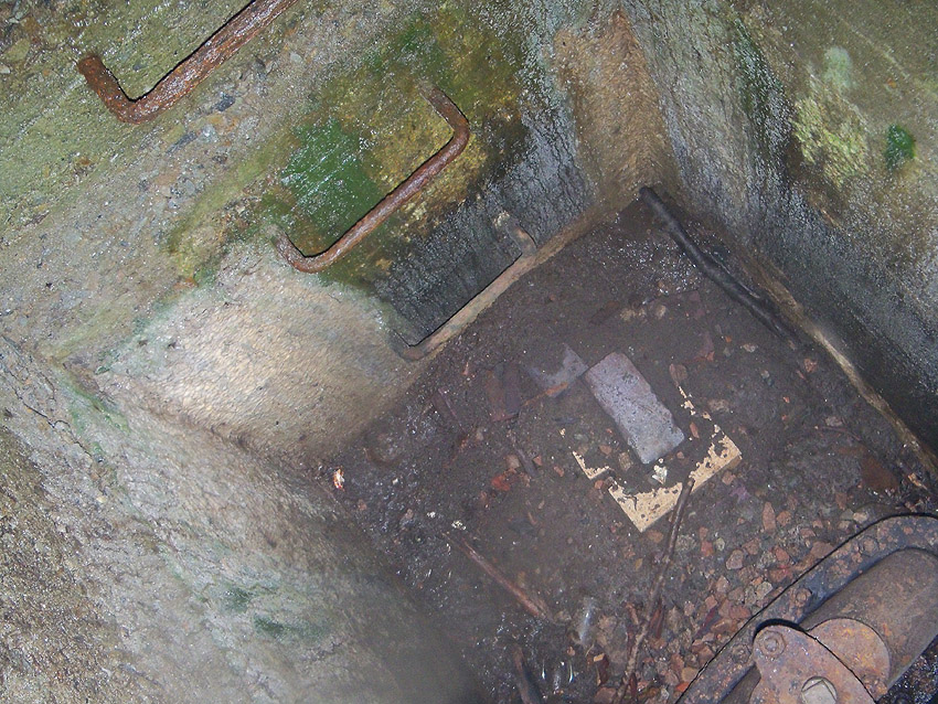 Wiesbadenbrücke: Die Decke des Tiefbunkers ist komplett zerstört. Vorhanden sind lediglich noch die Unterbereiche der Außenwände und die Sohlplatte. Der ehemalige Innenraumbereich des Bunkers liegt voller Trümmerschutt. Hier