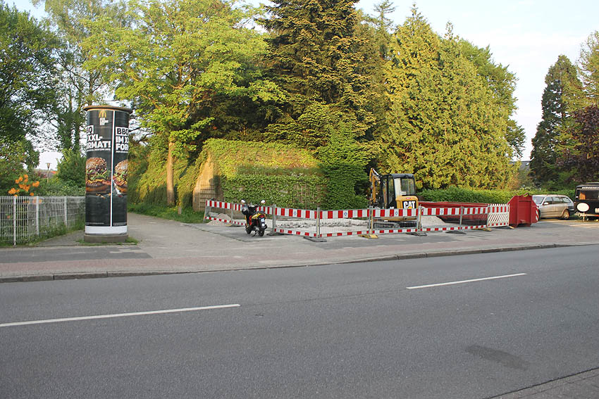 Abgerissen wurde jetzt wider Erwarten auch die Rundbunker-Fundamentplatte Allerstraße. Nachdem der Sockel des Neubaues bereits gefertigt war und keiner von uns mehr ernsthaft mit einem Abbruch der Platte rechnete, ist sie bedauerlicherweise nun zunächst in kleine Teile zerschnitten worden und wurde dann in "handlichen Bröckchen" abgefahren. Warum diese Maßnahme nicht vor den eigentlichen Bauarbeiten erfolgte, erst recht, da die Platte bereits ein kleines Stück für die Sockelecke des Neubaues abgefräst worden war, ist uns unverständlich. Ob noch Reste des Unterbereiches der Platte erhalten blieben, kann nicht gesagt werden, ist jedoch unwahrscheinlich. Hier