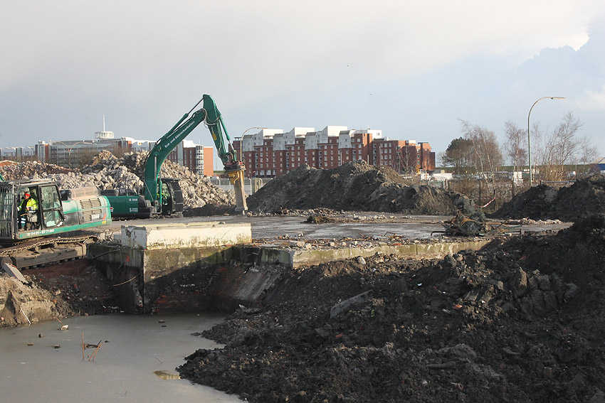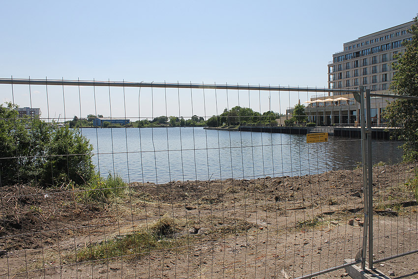 Wiesbadenbrücke: Wie schon erwartet, wurde auch der östliche Stahlbetonausleger in den Großen Hafen in den letzten fünf Tagen entfernt. Die Kuhle des abgerissenen Tiefbunkers wurde in der letzten Woche weiter mit Erde aufgefüllt. Lediglich die Bodenplattenreste und die vermuteten Gründungs-Holzpfähle dürften nun das letzte verbliebene Relikt dieser ehemaligen Luftschutzanlage unter Erdgleiche darstellen. Hier