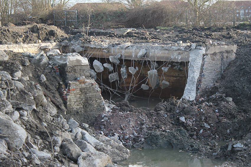 Weiteres zum Tiefbunker / 14.02.18: Die Anlage wurde am 10. Februar 2018 leergepumpt. Circa 600 qbm Wasser wurden abgesaugt. Während des eigentlichen Abrissbeginns (Bunkerdecke) wurde festgestellt, dass die Wände circa 1,80 Meter stark sind und die Decke etwa 1,50 Meter Stärke misst. Die Art der Bewehrung in Wand und Decke konnte bisher nicht ermittelt werden. So wie auch im Inneren die Oberbereiche der Wände zur Decke hin in circa 45 Grad-Schräge verstärkt wurden, findet sich auch außen um die Bunkerwände herum die Weiterführung dieser Verstärkung. All diese Bereiche sind mit einer Mauerwerksschicht versehen worden, um bei Nahtreffern im Erdreich eine Pufferung des Drucks (Verdämmungseffekt) herbeizuführen. Die leicht abgeschrägte (Regengefälle) Bunkerdecke und auch die Wände (unter dem Mauerwerk) sind komplett bitumiert. Der Bunker soll bekanntlich einen Bombeneinschlag erlitten haben, woraufhin dann die Decke mit Spannbetonträgern verstärkt wurde. Der Einschlag dürfte im Bereich / nördlich vom Eingang Süd stattgefunden haben. Hier sind alte Unebenheiten auf / in der Decke zu sehen. Der Eingang Süd, der die gleiche Form und Ausrichtung wie Eingang Nord hatte, ist im Unterbereich noch immer vorhanden geblieben. Der Eingangsvorbau wurde bis unter Erdgleiche abgetragen. Der Zugang selbst ist verschüttet worden. Eventuell geschah das schon im Krieg nach dem Einschlag. An der Nordostecke ist ein gemauerter Schacht mit Steigeisen am Bunker vorhanden. Dies könnte der Rest eines Eingangs 3 (Notausstieg mit Turm) sein. Im Gegensatz zum ersten Eindruck sind die Folgen der innerlichen Nachkriegssprengung äußerlich doch recht überschaubar geblieben. Auch die Bunkerdecke selbst weist fast keine Schäden dieser Sprengung auf deren Dachfläche auf.