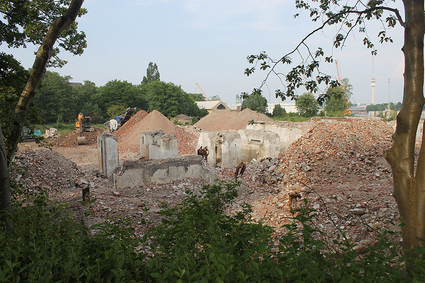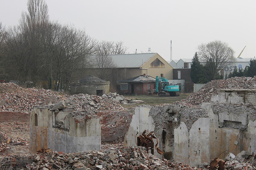 Ehemalige Südzentrale: Die Schuttbeseitigungsmaßnahmen sind wieder aufgenommen worden... Nun steht sogar eine Brechmaschine zur Trümmerzerkleinerung auf dem Gelände. Wir berichten hier weiter.