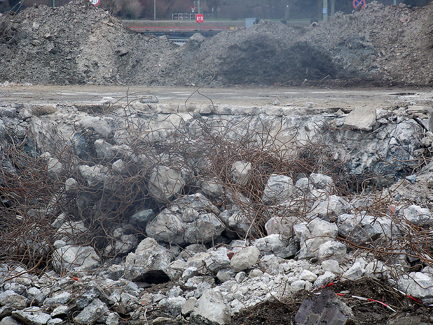 Wiesbadenbrücke: Alles ist abgerissen bis auf den Tiefbunker. Gewaltige Betontrümmer der Nachkriegsbauten-Fundamente türmen sich auf dem Gelände. Hier