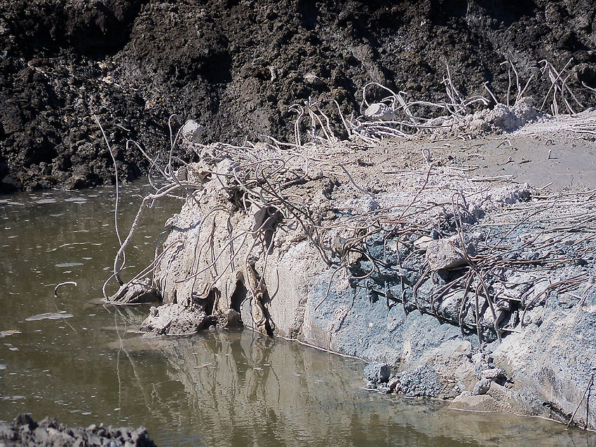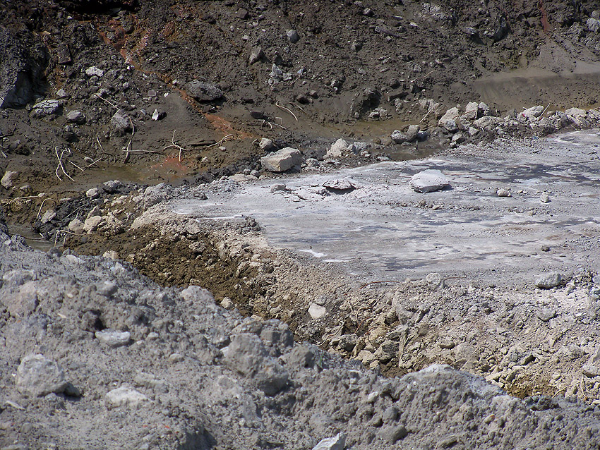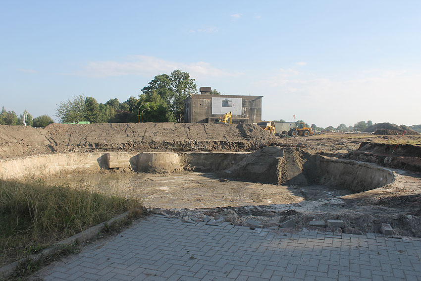 Sanierungsgebiet TWWP - Im westlichen Bereich der Zerschellerplatte des T 750 wurde ein Teilstück weggebrochen und ein "Tunnel" bis etwa einen Meter unter das eigentliche Bunkerfundament getrieben. Hiermit sollte festgestellt werden, auf wieviel Pfählen der Bunker gegründet ist. Die Freilegung von zwei Pfählen reichte dafür wohl zur Berechnung aus. Die Maßnahme soll nach unseren Informationen nötig gewesen sein, um Statikwerte bezüglich des geplanten Überbaues des T 750 zu berechnen. Nach etwa einer Woche wurde die Öffnung dann wieder verfüllt und die zerstörte Zerschellerplatte in dem Bereich neu mit Betonschlemme ausgefüllt. Die eigentlichen Sanierungsarbeiten auf dem Gelände "wandern" nun weiter in Richtung Westen in etwa abschließend mit der westlichen Bunkerwand. Im Oktober sollen die Arbeiten abgeschlossen sein. Auch die verbliebene Fundament-Sohlplatte des Öltanks "Grodenfähre Nord" wurde mittlerweile zerkleinert und abgetragen. Bilder vom 25. und 8. August 2018. Hier