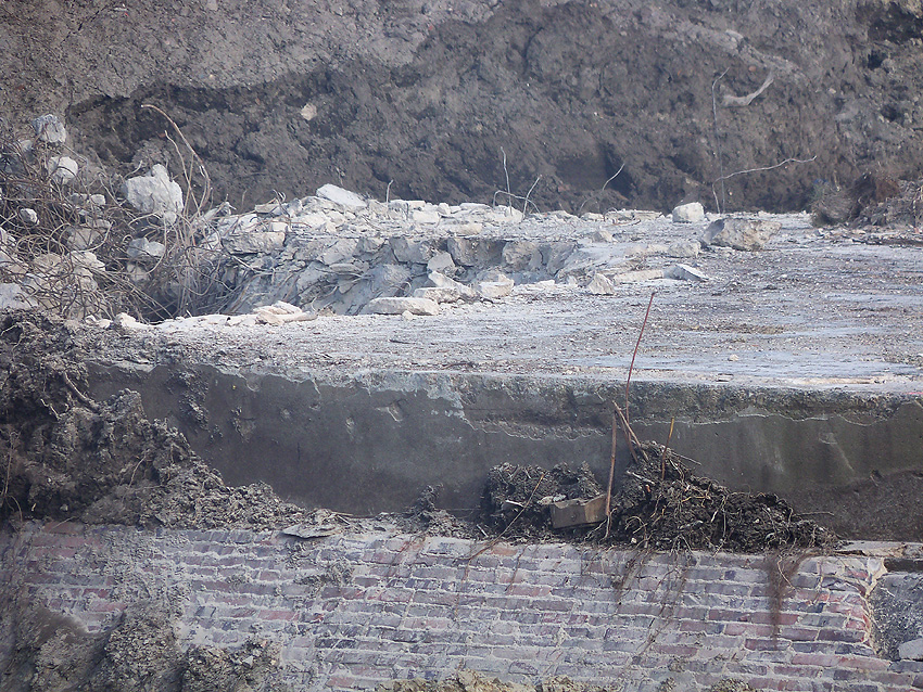 Weiteres zum Objekt 2 / 14.02.18: Das westliche beider "Quadrate" bestand aus zwei nebeneinander gesetzten massiven 3,50 Meter tiefen Betonquadern (unbewehrt). Der Bereich wurde am 7., 8. und 9. Februar 2018 abgebrochen. Eventuell handelte es sich dabei um eine Art Fundament für einen Lastenkran. Vielleicht sogar um eine Art Schwerbelastungs-Testkörper?