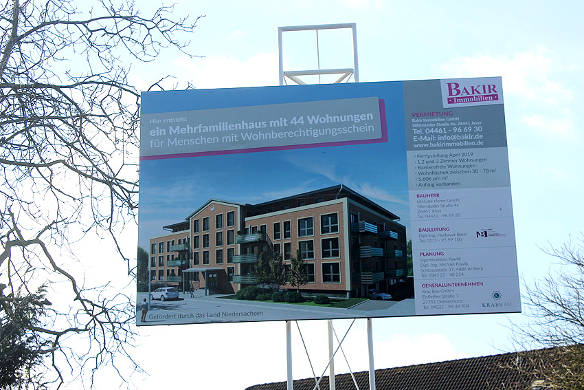 Ehemalige Schule Allerstraße / Rundbunker-Fundamentplatte: Ein Bauschild mit dem projektierten Vorhaben wurde aufgestellt. Das Gelände wurde weiter bereinigt. Wir berichten weiter. Hier