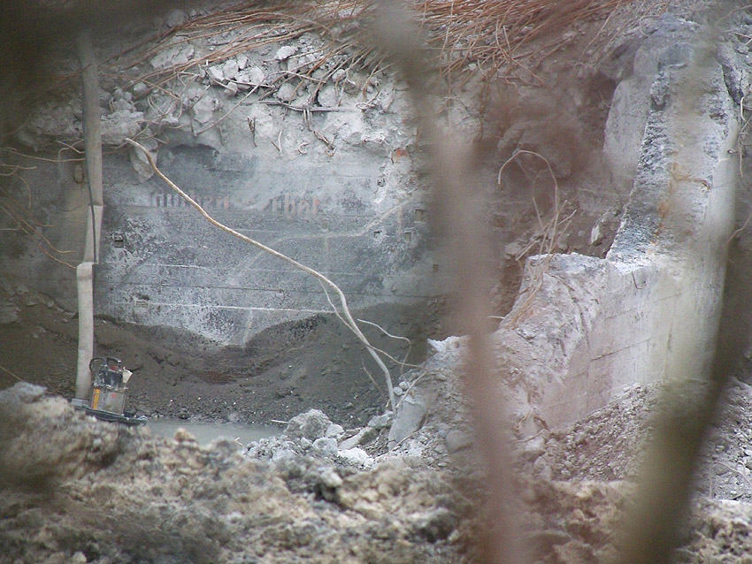 Wiesbadenbrücke: Der Tiefbunker ist mittlerweile bis auf die Sohlplatte und einige Teile der massiven Außenwände vernichtet. Ein letzter "Rauchen verboten"-Schriftzug im Nordwestbereich des Restbunkers ist kurzzeitig erkennbar gewesen... Hier